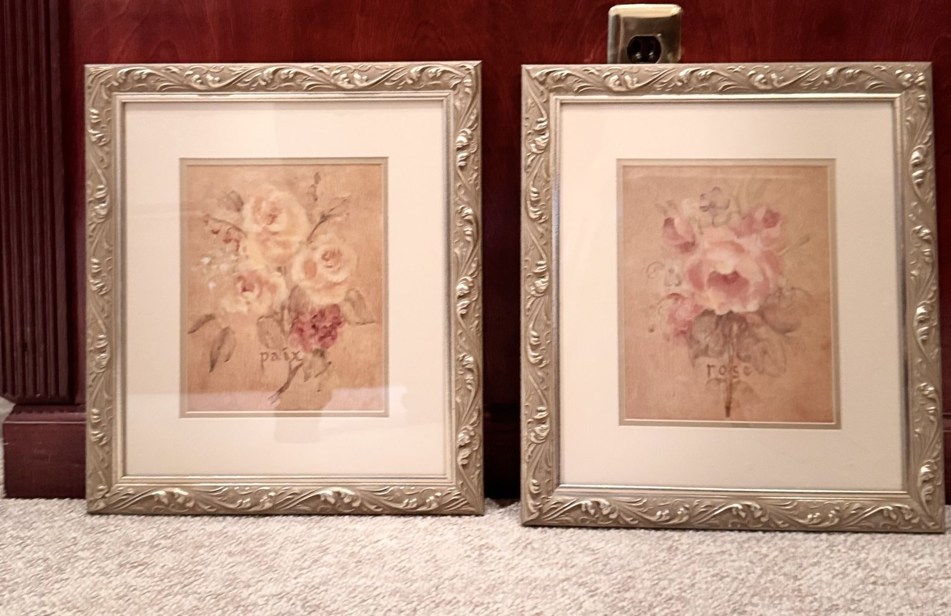 Pair of Elegant Floral Print Gold Framed Wall Art Excellent Condition Each print measures approx 17.5" x 15.5" Frame molding is approx 1.5"