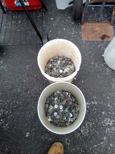 Two 5 Gallon Buckets Half Full Of Galvanized Roofing Tabs $20 Each Or Both For $30