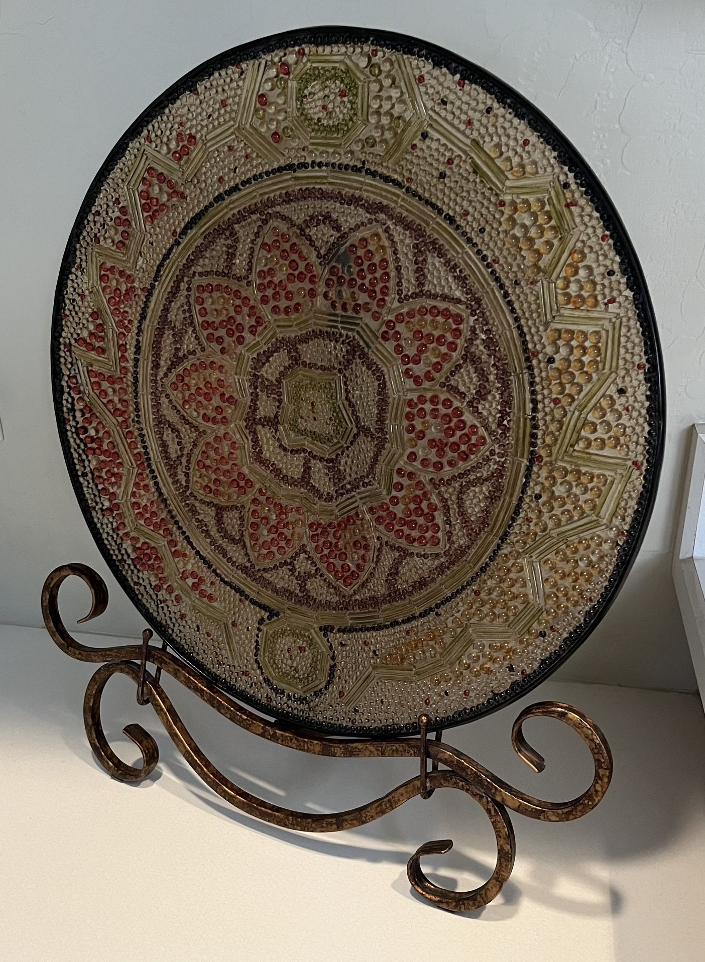 Beautiful large patio decor with bronze stand in excellent condition from Today’s Pool and Patio it can be used inside or outside, we used it inside only. The plate is 18” diameter and total height with stand is 22”.