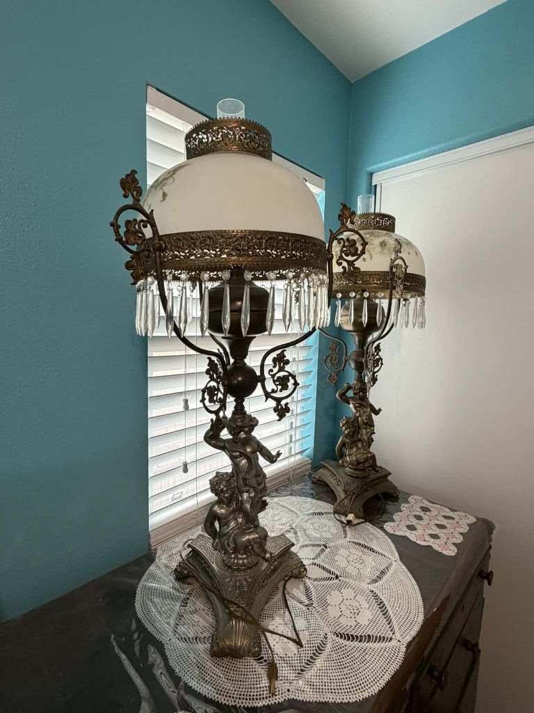 A set of two antique lamps see photos pick up Yucaipa, height 39 inches , globe area 18 wide. Tested