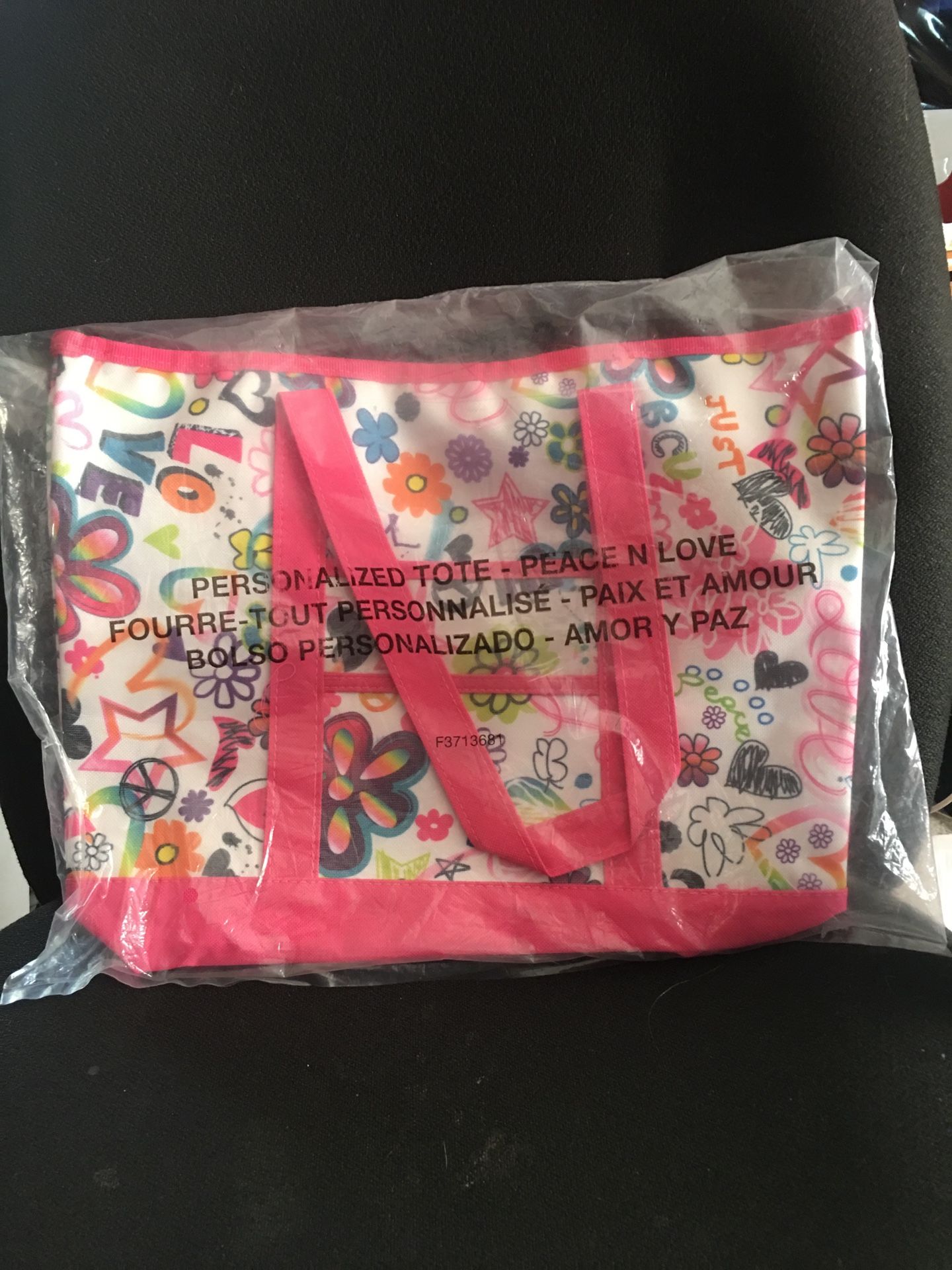 Personalized tote peace and love Avon brand for girl . New .peace and love by Avon .,dimensions 13.5 inches width x 14” height x 12” length .