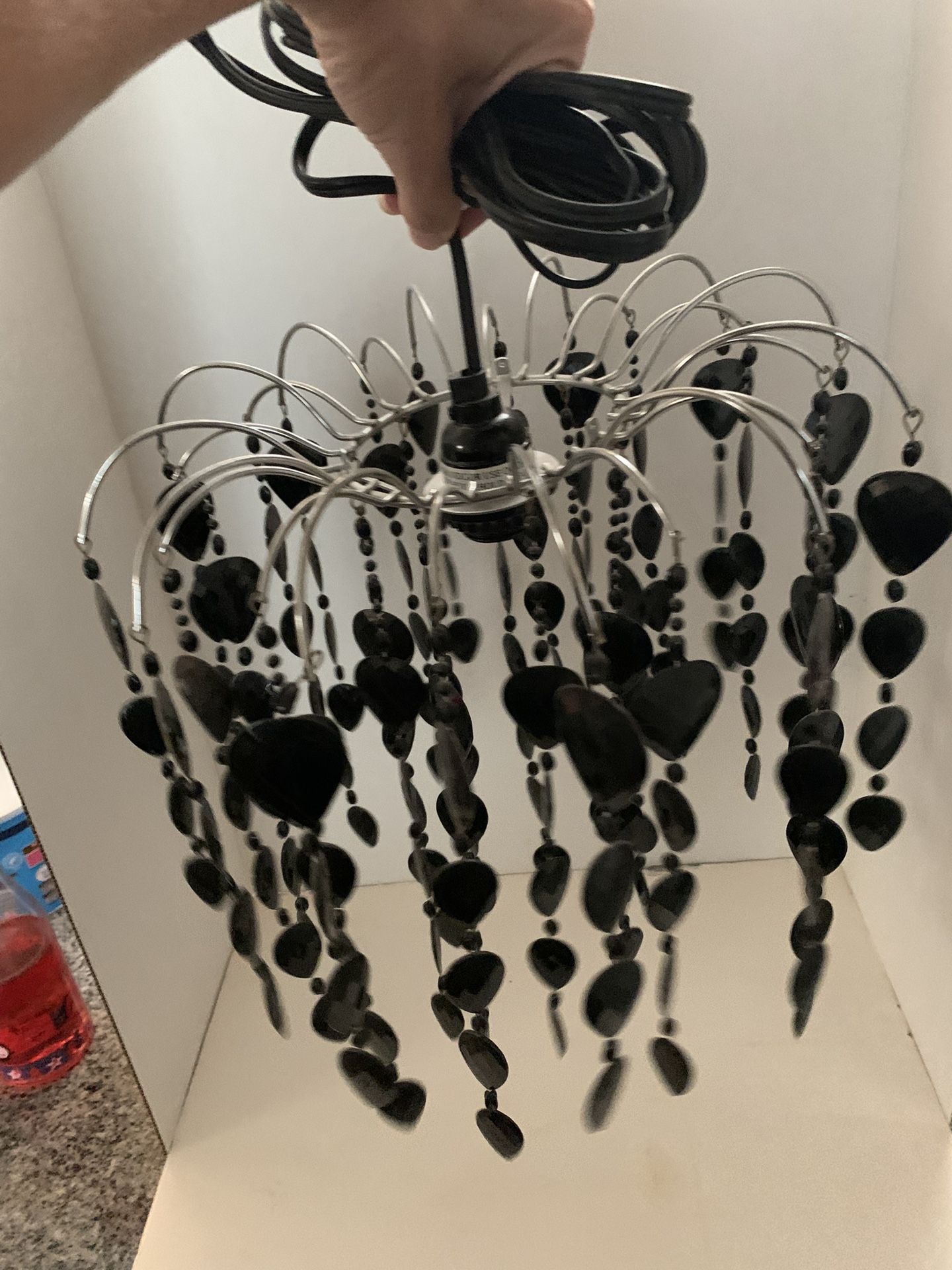 This Black Waterfall Beaded chandelier or lampshade is a great alternative for setting up hallways, or just to add special accent décor to your home. * 12" Inches DIA X 13" Length + 23" Inches Length With the Chain * 12 Feet Light Socket Cord + Light Kit Included * electric hookup/plug-in. * Max 75 watts light bulb not inclued * Acrylic Crystal Teardrop Beads * Overall Product Weight: 2lb * NO DELIVERY AND NO SHIPPING AVAILABLE. CASH ONLY!! No Exceptions!