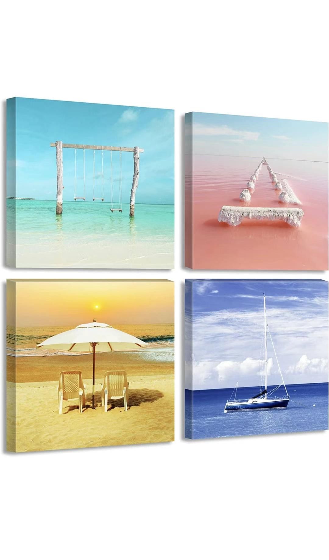 Beach Decor - Ocean Wall Art for Office Bathroom Teen Girl Bedroom Decorations Blue Pink Yellow Sky Blue Beachy Picture Trendy Posters Canvas Prints Stretched And Framed Ready To Hang 12×12 Inch×4 Pcs