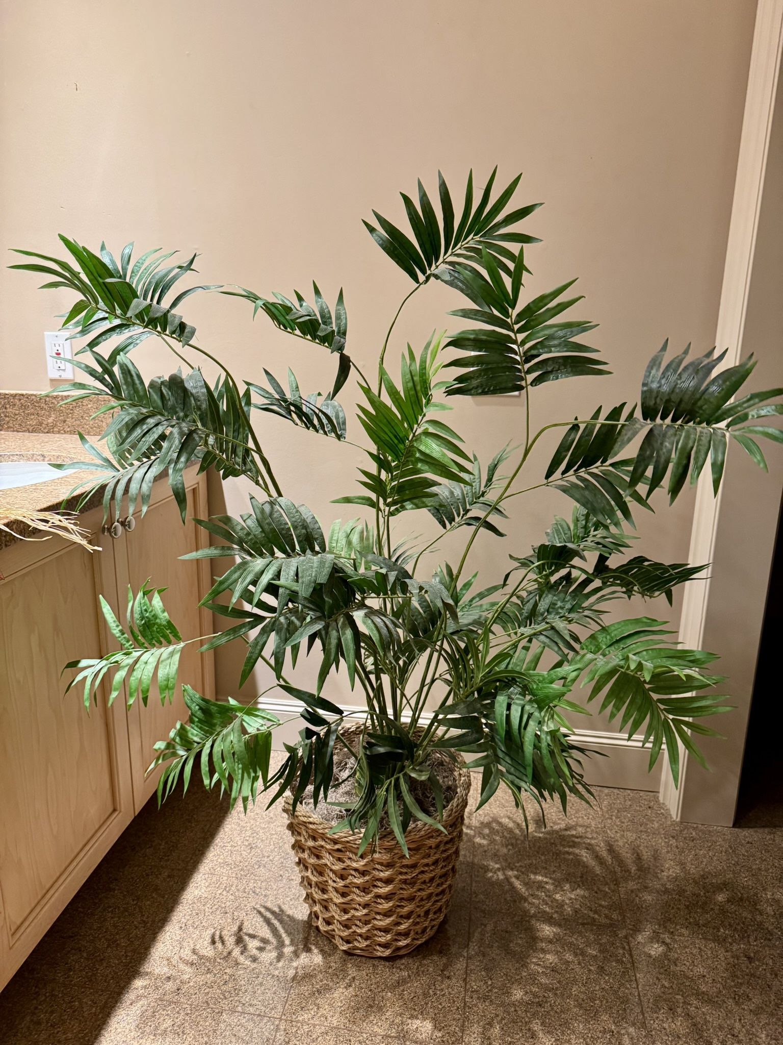 Beautiful large palm plant in a woven basket. (Needs dusting)