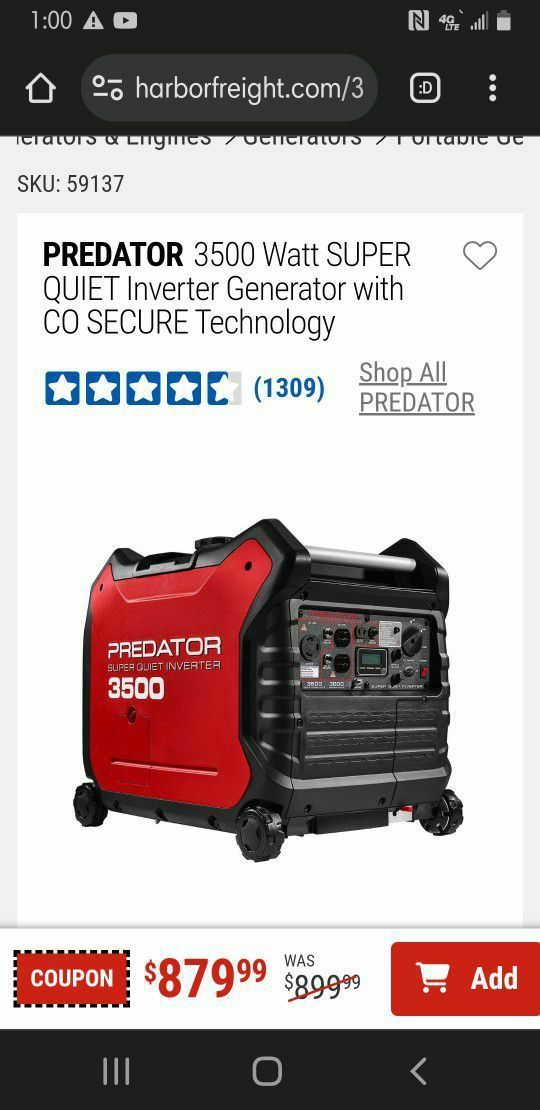 We have two! One is barely used, asking $750. The other is brand spankin' new and we're still only asking $800. These puppies are super easy to use. This PREDATOR® SUPER QUIET™ 3500 Max Starting Watt, 3000 Max Running Watt Inverter Generator uses a reliable PREDATOR® 212cc engine to deliver clean, efficient power where it's needed most. With a 2.3 gallon fuel tank, this closed frame inverter generator delivers runtime up to 11 hours @ 25% load. Designed for efficiency, this inverter generator is built with Electronic Speed Control Mode (ESC Mode) to optimize engine performance, maximize runtime and lower fuel consumption. Rated at 56 dBA, this 3500 max starting watt closed-frame inverter generator delivers plenty of power while operating at the same volume as a quiet conversation. The lightweight, compact design is ideal for RVs and other applications. Smooth-rolling wheels provide effortless portability. Comes with an RV adapter. Longer runtime: up to 11 hours @ 25% load per fill-up Powerful PREDATOR® 212cc engine provides plenty of power for RVs and other applications CO SECURE® technology automatically shuts down the generator for safety when harmful levels of carbon monoxide are detected Pure sine wave inverter technology safely powers sensitive electronics such as smartphones, laptops, and TVs Electric start with non-spillable battery (included) for easy starts every time SUPER QUIET™ enclosure significantly reduces generator noise levels, operating at only 56 dBA Electronic Speed Control Mode (ESC Mode) optimizes engine performance to maximize runtime Includes four wheel system for easy portability Includes: (2) 120V 5-20R outlets, (1) 120V L5-30R twist lock outlet, (1) 12VDC Complies with ANSI/PGMA G(contact info removed) standard