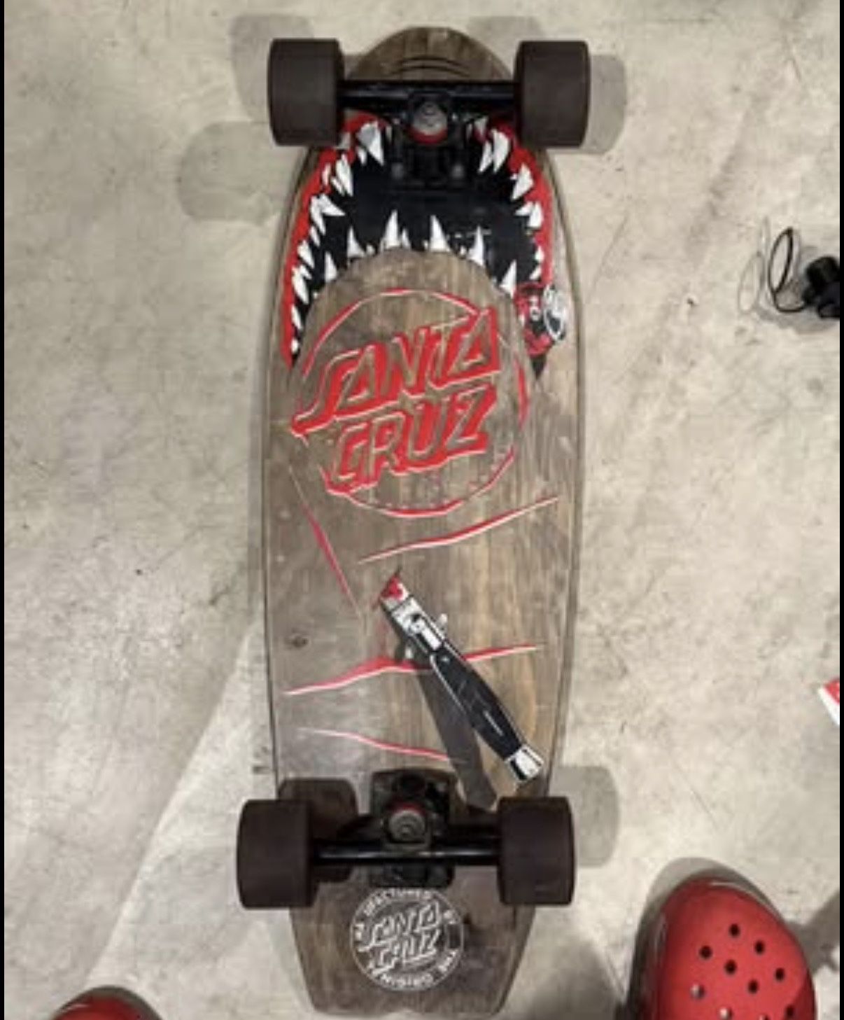 This is a vintage style Santa Cruz skateboard in used condition. The deck has some wear and tear from regular use — including a chipped and cracked front edge (see photos). The board is still solid overall and rides fine for cruising or display. Brand: Santa Cruz Shark Condition: Used – deck shows cosmetic damage on the nose (front), but no major structural break affecting rideability. Wheels: Light up when rolling — look great at night! Trucks & Bearings: In working order and roll smoothly. Grip Tape: Worn but functional. This would be a great board for someone who wants a vintage style cruiser, a display piece, or a project restoration.