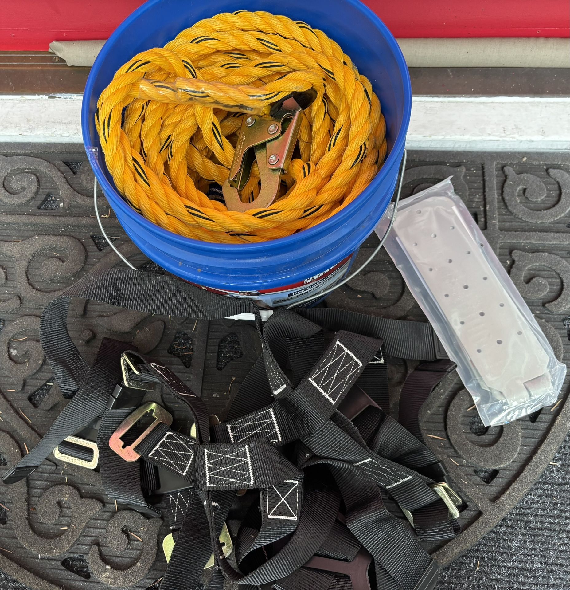 Palmer Safety Pro Collection Fall Protection Harness in Bucket, like new condition. Safety and Security: The Palmer Safety Bucket is designed to protect roofers and crew members from accidental falls during construction, roofing, thatching, and high-rise window purpose cleaning tasks. 🧰 Comfortable Fit: The full-body harness features adjustable points and an anti-slip back placard to ensure maximum user comfort during rigorous testing standards. With a maximum free fall of only 6 feet, it provides ultimate protection. 🧰 50' Life Line - Lifeline assembly comes with an integrated shock absorber that eliminates the need for an additional shock-absorbing lanyard, reducing dead weight transferred to the dorsal D-ring and increasing user comfort and reducing fatigue. 🧰 Durable Design: The waterproof roofing safety kit includes a steel, polyester harness, anchor, and lifeline, all packed in a durable bucket for easy transport between job sites. Specifications: The OSHA and ANSI compliant kit has a weight capacity of 130-310 lbs, includes a universal harness, reusable anchor, 50 feet vertical lifeline assembly with shock pack