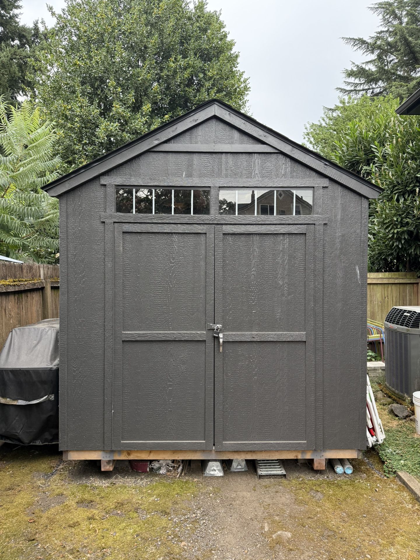 Handy Homes Majestic 8x12 shed with shingles, roof vents, and floor. It’s weird that I have to say it has a floor, but some don’t I guess. It’s only 2 years old. There is a spider in it (not why we are selling it) that keeps it bug free. He’s a good spider, his name is Jim. We ask that you keep him employed after the transition. The shed is painted, sits on 4x4’s so no slab needed - but you can still put it on one. You’ll probably need to disassemble it to take it home. It’s nail construction, not screws. If you have a decent trailer and the cojones you may be able to get it home without disassembly. Here’s a link to the exact shed from Home Depot: https://offerup.com/redirect/?o=aHR0cHM6Ly93d3cuaG9tZWRlcG90LmNvbS9wL0hhbmR5LUhvbWUtUHJvZHVjdHMtUHJvZmVzc2lvbmFsbHktQXNzZW1ibGVkLU1hamVzdGljLURlbHV4ZS04LWZ0LXgtMTItZnQtT3V0ZG9vci1Xb29kLVN0b3JhZ2UtU2hlZC13aXRoLUJsYWNrLVNoaW5nbGVzLTk2LXNxLWZ0LTYwMjE5LTEvMjA1OTIyMTQ5