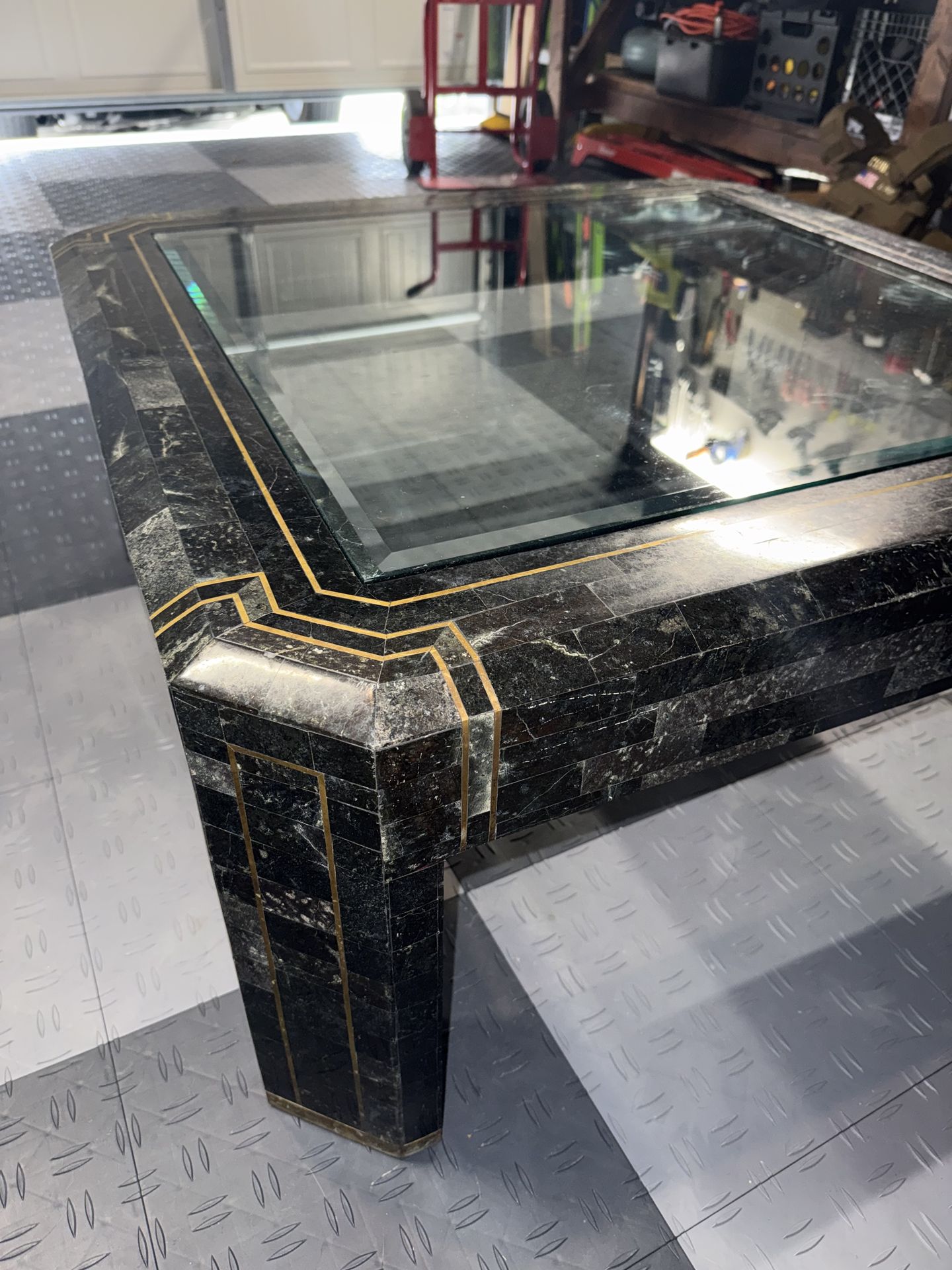 Tessellated black marble with Brass lining. Alexvale Furniture Inc. Made in Philippines 1987 Good condition. Minor chips and easy fixes.
