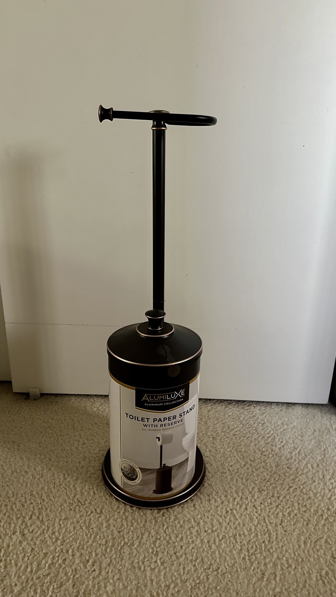 Stand with enclosed storage. Keeps your toilet paper clean.