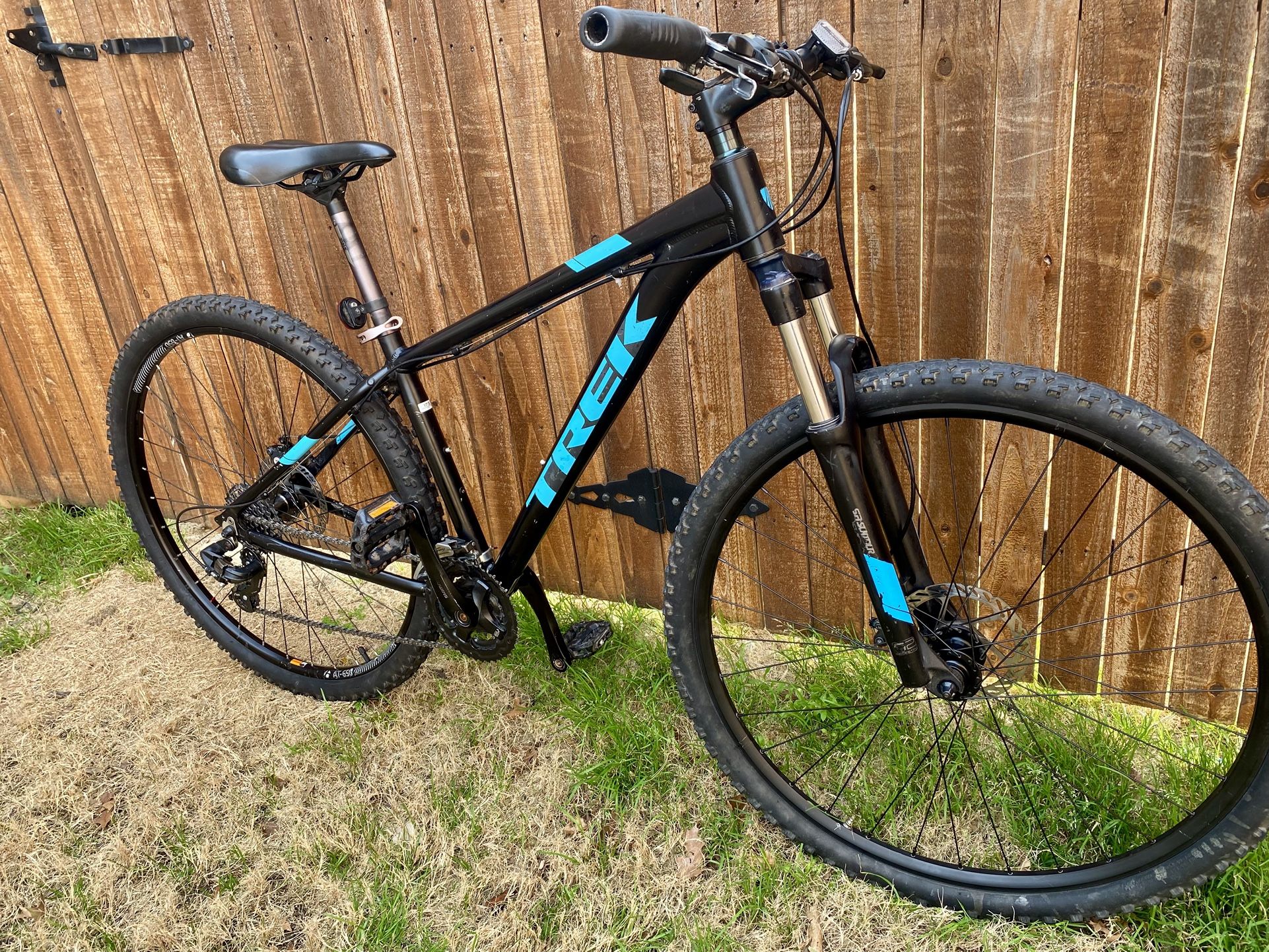 Up for sale good looking trek Marlín 5 29er Mountain bike, no ecxellent working condition, some scratches, on frame, just tuned & inspected, ready to Roll. Medium size aluminum frame 29 inch bontrager wheel set 29x2.10 inova tires Shiamano gear set Shimano crank set Bontrager seat post Specialized sadle Bontrager stem Bontrager handle bar Mechanical disk brake Bicycle sold as is Delivery avíalable Para español mandé mensaje