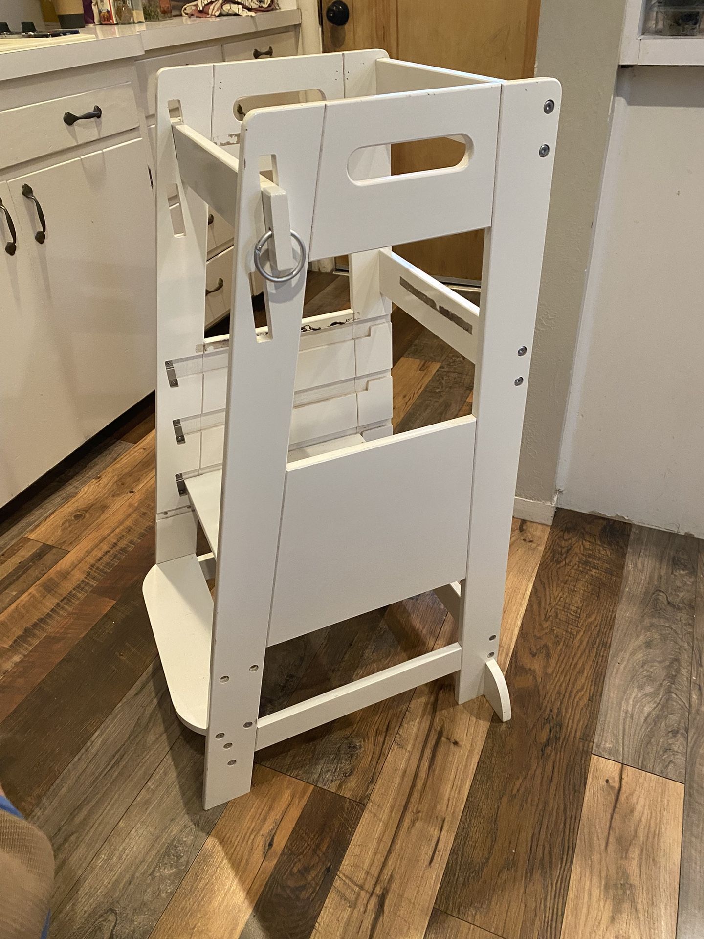 Toddler Kitchen Tower We found it great for ages 2-4. Platform has 3 different height settings. Things we used it for included learning to wash dishes, baking, painting at an easel, washing hands etc. It is well built compared to some on the market the only down side is this one doesn’t fold up. However this one has a safety bar so the child doesn’t fall backwards. Only getting rid of it because my child is only enough now to use a small step stool without falling. Condition is good with minor dings in paint, there is some double sided tape marks that could be removed with some goo gone.