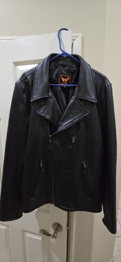 Mens leather jacket 3xl but fits like a 2xl XxxL but fits like a xxL Only worn a couple times. 2 inside pockets, one is a secure closure pocket