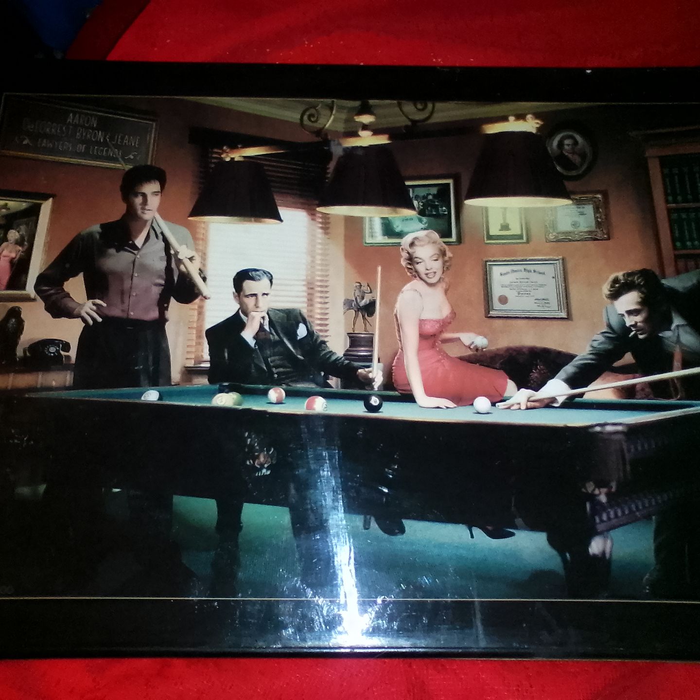 Legal Action Art Print Featuring Iconic Hollywood Legends Elvis Presley, Humphrey Bogart, Marilyn Monroe, And James Dean Playing Pool. Artist is Chris Consani Price $20