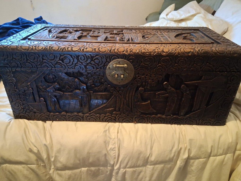 This cc trunk is in exceptional condition for its age. Deeply carved, beautifully on the entire surface. An amazing example of the early camphor trunks. I have not found any stamps on it. It has the removable tray and this inside is in nearly new condition. I do have the 4 dragon claw over ball feet for it. Though they are detached now to protect them, one of the feet needs restored before remounting. A minor repair for best value. Still, having the original feet to restore is valuable in and of itself. This is a beautiful piece of history and art, as well as functional. If you know antiques at all, you understand the value in its condition. Must sell for personal reasons, and priced as such. Thanks for your time....
