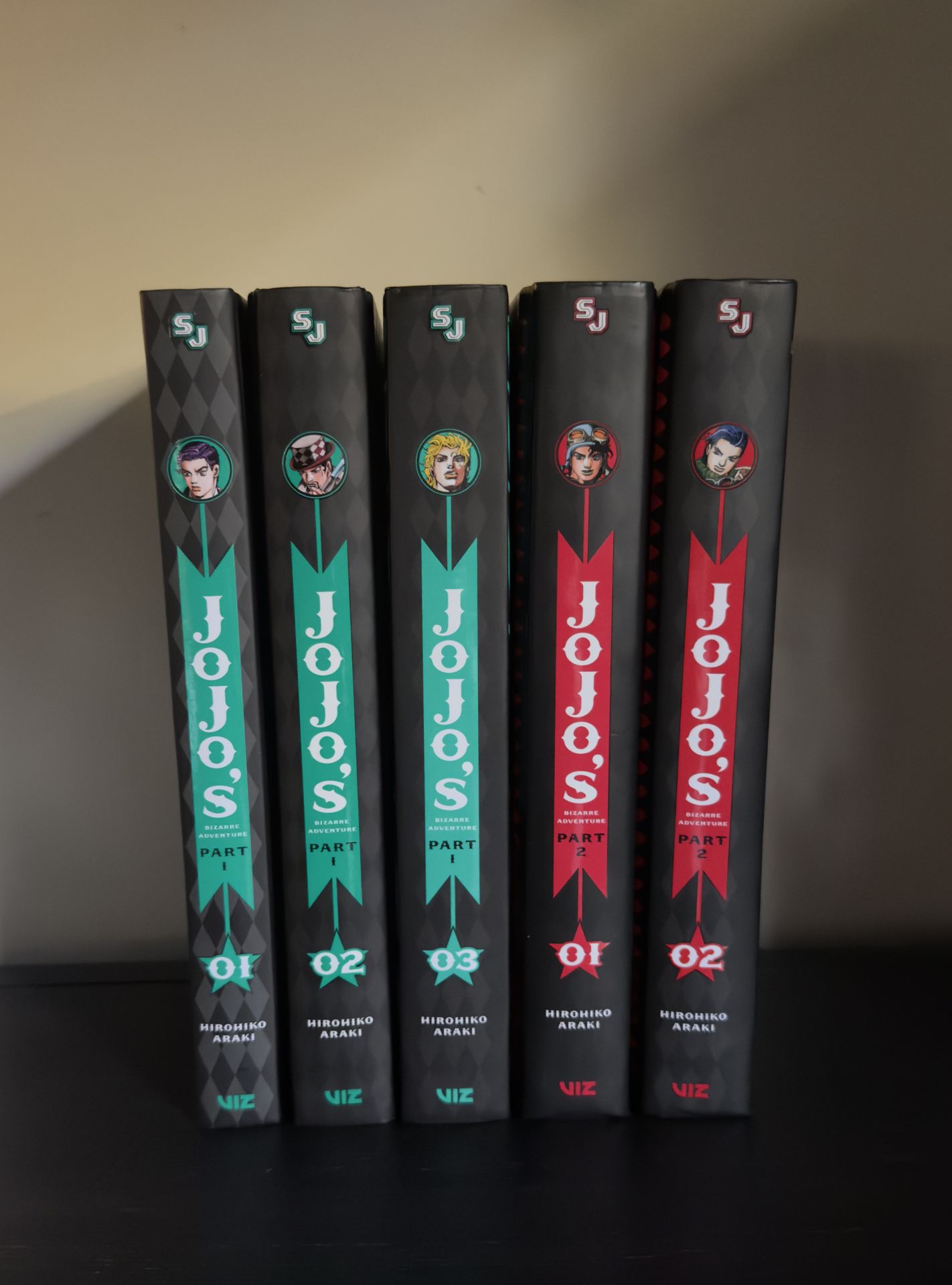 Jojo’s Bizarre Adventure Hard Cover Manga English Part 1 Volumes 1 - 3 Part 2 Volumes 1 - 2 Read them once they’ve been on my shelf for quite a while been cleaning them once a week no dust they are new no damages I can negotiate on price