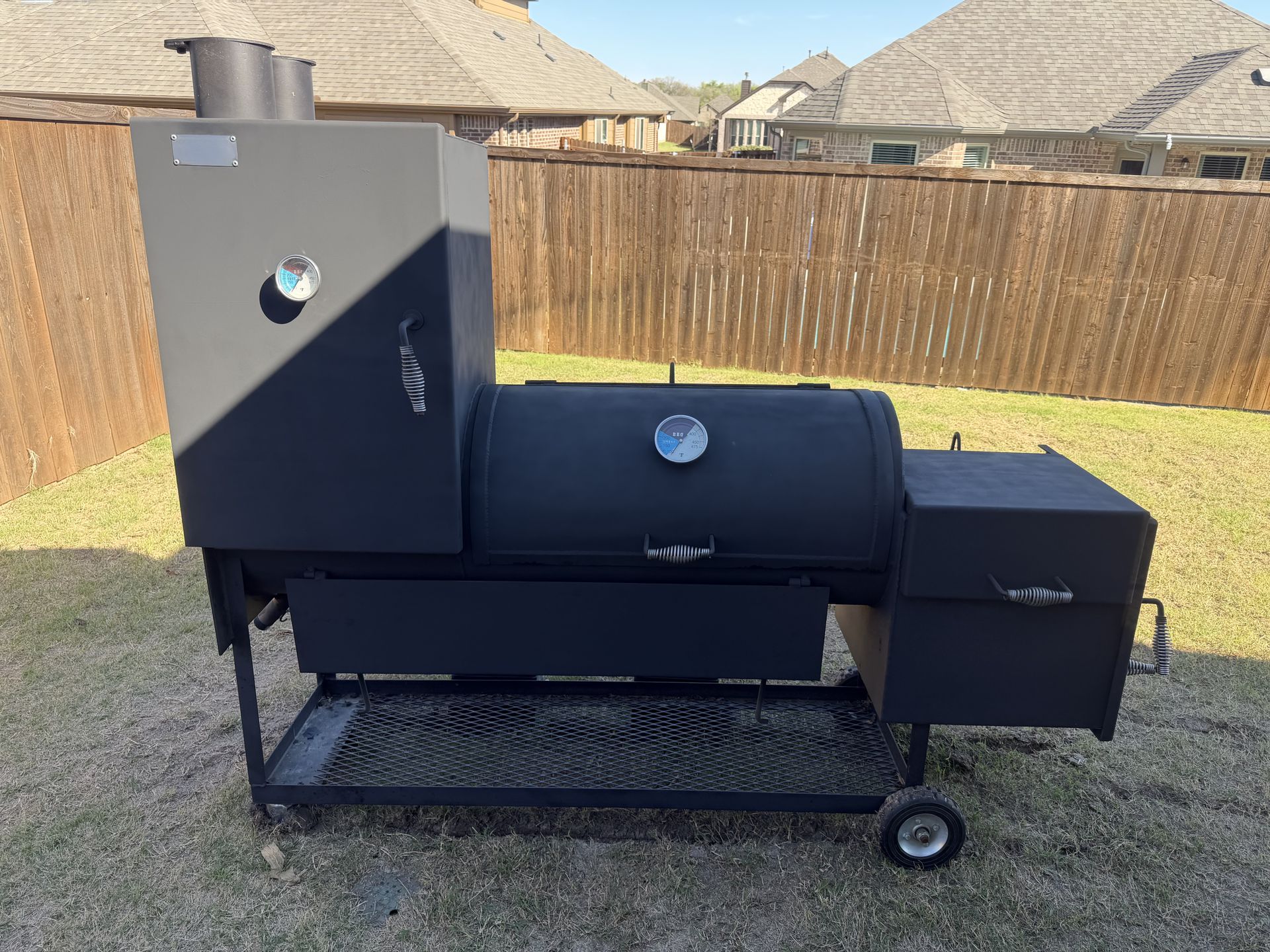The smoker is a “like new” Old Country Angus and has only been used a handful of times. I’ve had this since the end of December and simply don’t think it’s for me. This thing works amazing and retains the heat nicely; no problems whatsoever. It’s been covered and kept under a covered patio so no rust. I still have my receipt for warranty that I can transfer over. Be sure to bring help as it is heavy duty welded steel. I’m located in S Fort Worth/Crowley area. - Folding front table - Pull-out metal grates - Stainless-steel handles for safety - Fire Box 19.5 X 19.25 in - Main Grate 17.5 X 32.75 in - Vertical Grates 19.25 X 19.25 in (x3) - Heavy Duty 3/16" ga