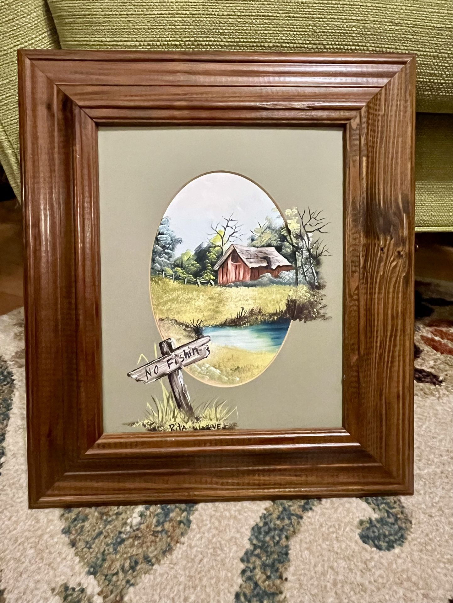 Framed, signed and sage green matted painting. Features a beautiful farm scene in a wooden frame. Piece has a wire hanger. Age appropriate condition. Artist signature on the left side. No structural damage or punctures. Would make an excellent addition to any home or office. Tape measure included in photos. Will ship for additional cost.