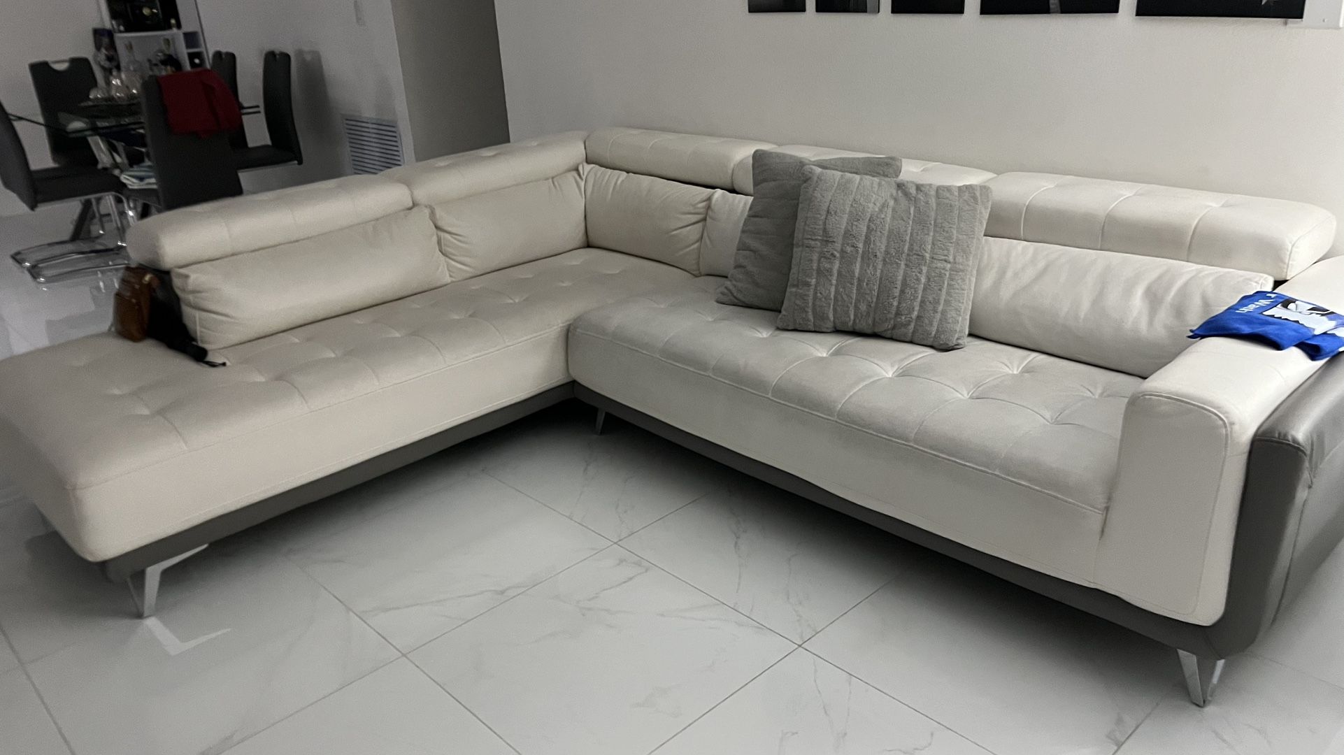 Seccional de 6 plazas en L , más un reclinable eléctrico, con porta vaso y conector usb, es de uso un poco gastado el material, los juntos 150 dólares
