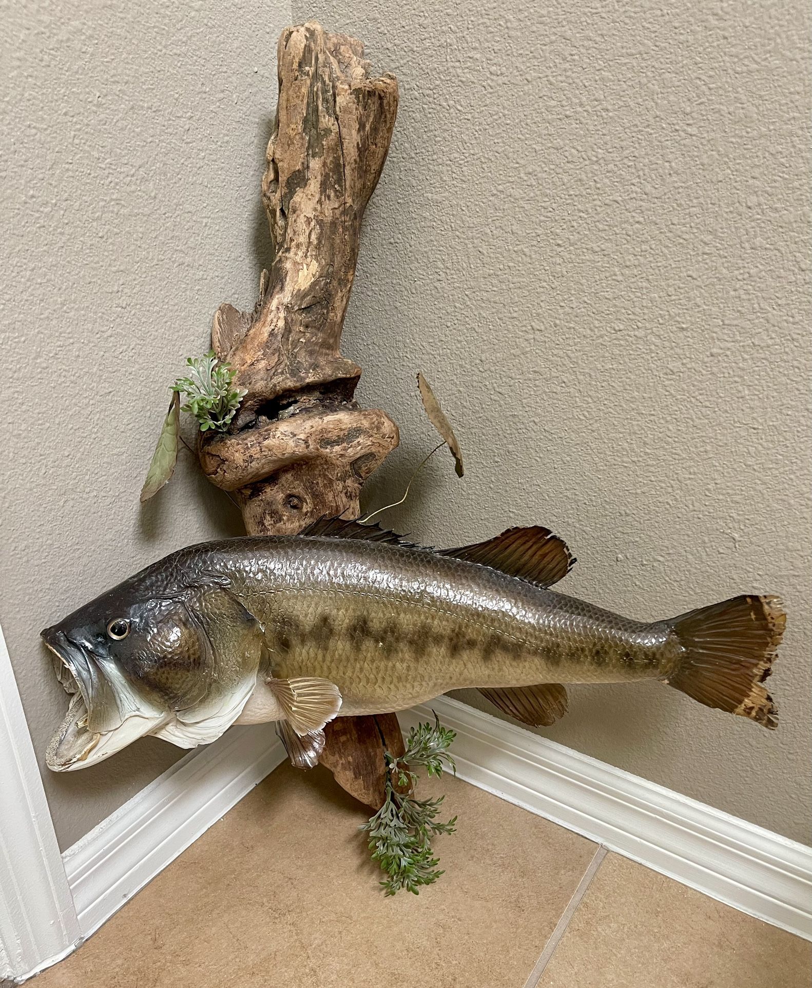 Large piece, really nice. Good for Man-cave! Bass approx. 21” Driftwood measures approx. 29” bracket on back to hand Slight feathering on tip of tail