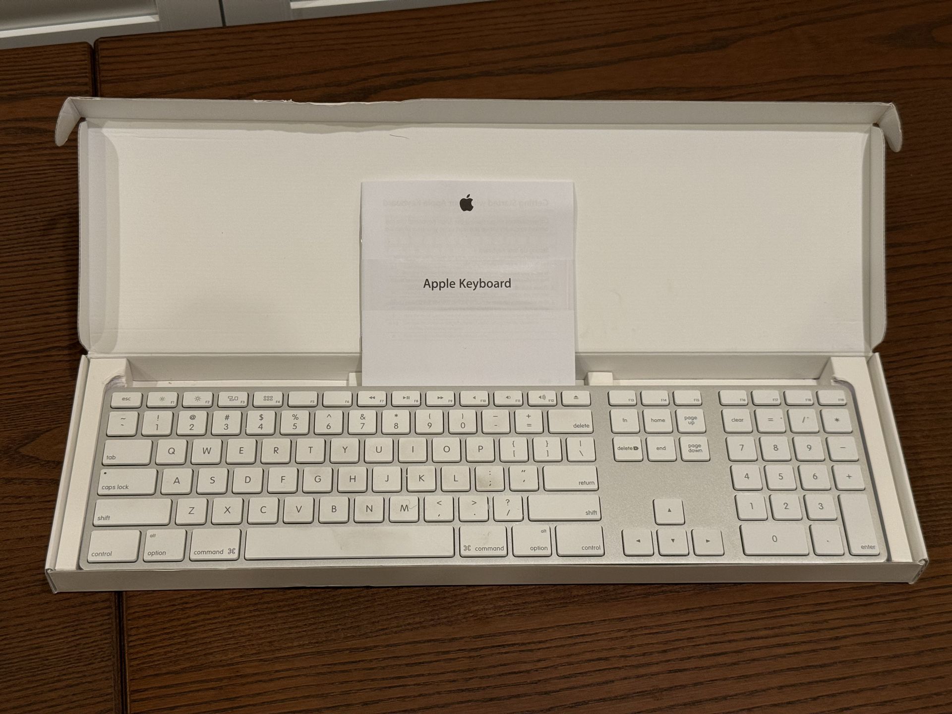 Genuine Apple Wired USB Keyboard with Numeric Keypad (Model A1243 / MB110LL/B). Full-size aluminum keyboard in excellent condition — all keys work perfectly. Comes with original box and documentation. Features: - Slim aluminum body with low-profile white keys - Full numeric keypad + navigation keys (Home, End, Page Up/Down) - Two built-in USB 2.0 ports (great for plugging in a mouse) - Plug and play — works with any Mac or PC with a USB port - No batteries needed — wired connection, always reliable Great keyboard for anyone who prefers a wired setup over Bluetooth. These have a cult following and Apple no longer makes them. Sold as is.