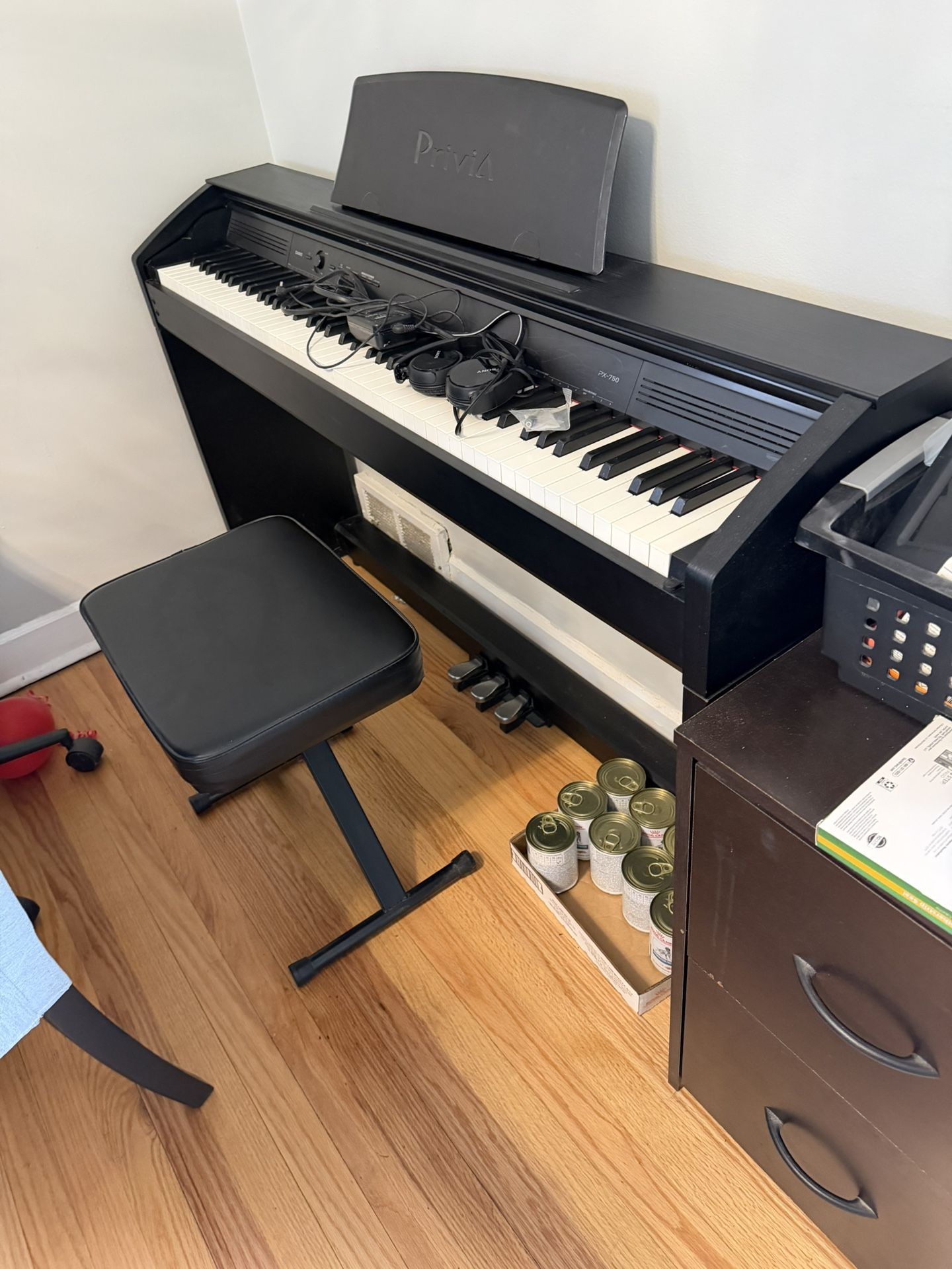 Electric piano/keyboard 88 weighted keys use for piano lessons. Electric paino that has the functions of an electric keyboard and the feeling look of authentic piano. Comes with headphones and adjustable paino stool/chair. Full retail price is $899+ shipping