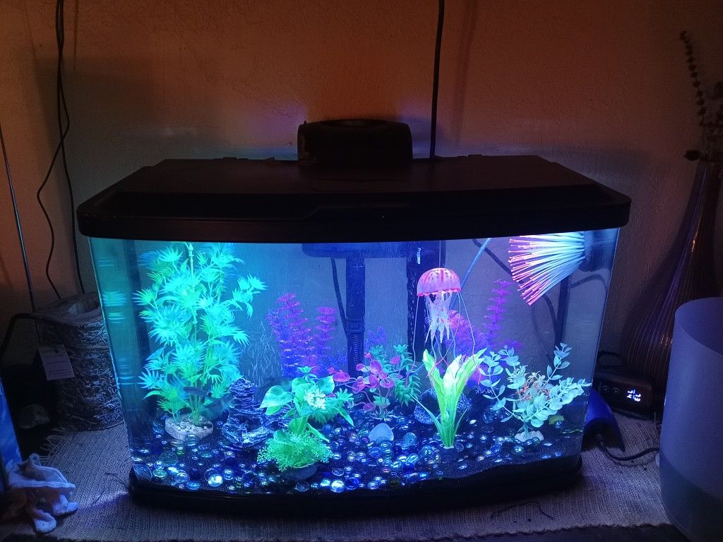 I have a 20 gallon Fish tank with bow front and five fish, 2 automatic feeders, brand new box of filters, a box of "goodies" that are all newer, 2 open cans of fish food and one brand new one to go with! Also have the rock cleaner hose thing. Also there are three more tanks to go with it, one 20 gallon tank and two 2 and 1/2 gallon led light tanks. 23in wide (side to side) x 15in tall x 10in deep (front to back) Thanks for looking!
