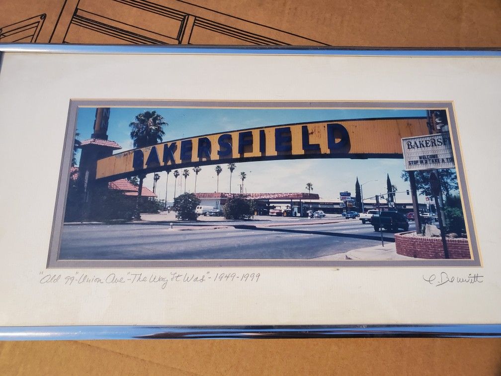 Original BAKERSFIELD Street Sign Picture Framed. Comes With Original Yellow Painted Metal Backing From Buck Owens Production Co. * Union Ave. From June 1949 - June 1999 Also Comes With Architect Signature And Proof Of Original Build Plan Sketched Information Dated 2-9-2000. *If You Would Like To Own A Piece Of Bakersfield History For Your Home Or Office.. Maybe Even Man Cave! Now Is your Time. Thanks For Looking!