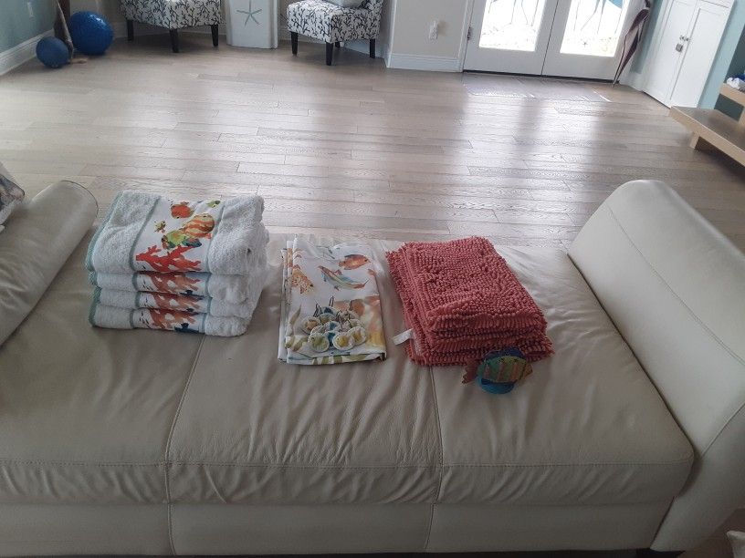 Shower Curtain, hooks, 2 bath mats, 4 towels, candle holder, Bealls