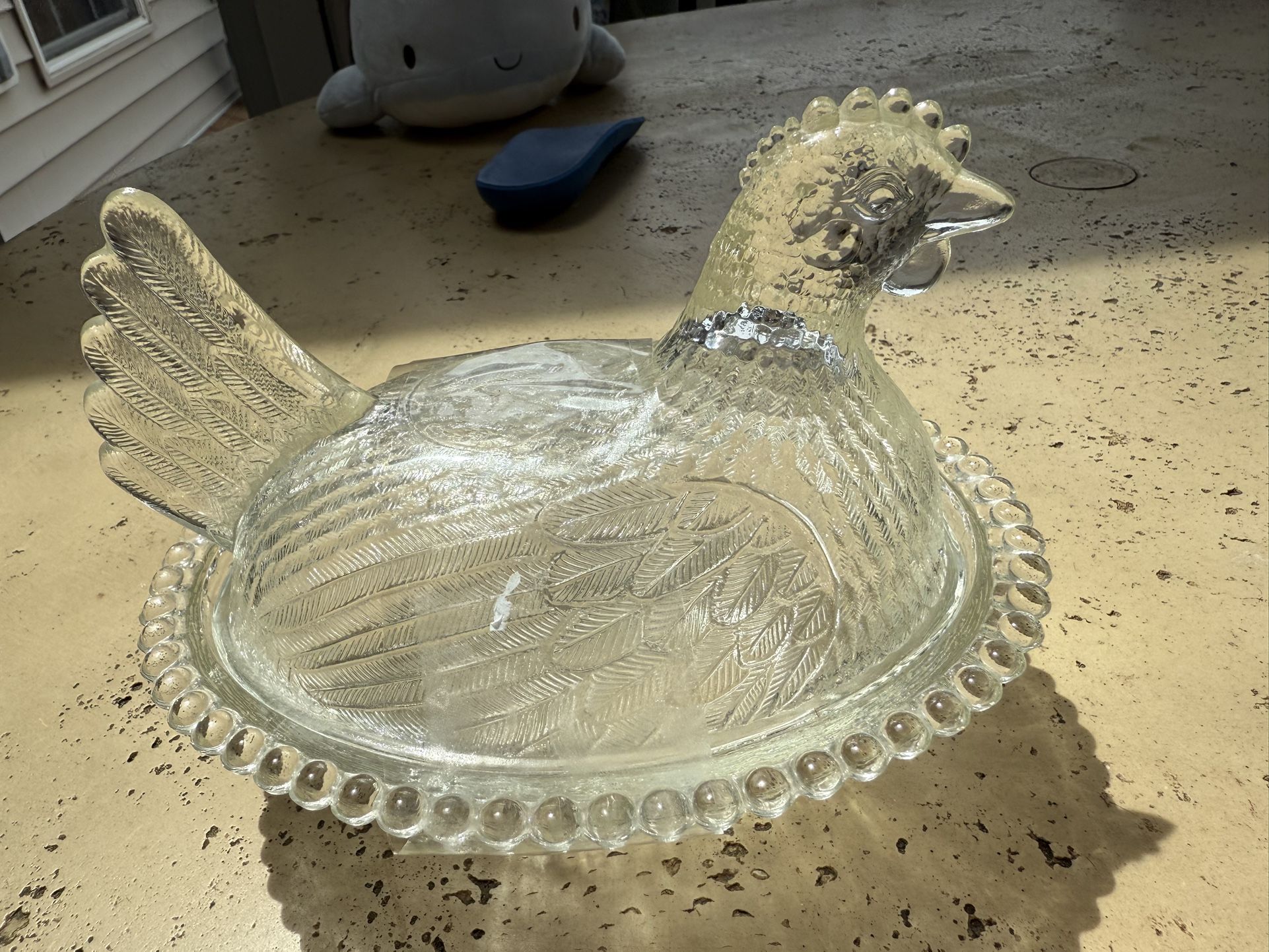 INDIANA GLASS ROOSTER 22.00 cash only clear glass 5 1/2 inches tall by 8 inches wide no issues leesburg pick up remove the rooster lid for a bowl that you could put candy in or any other item.