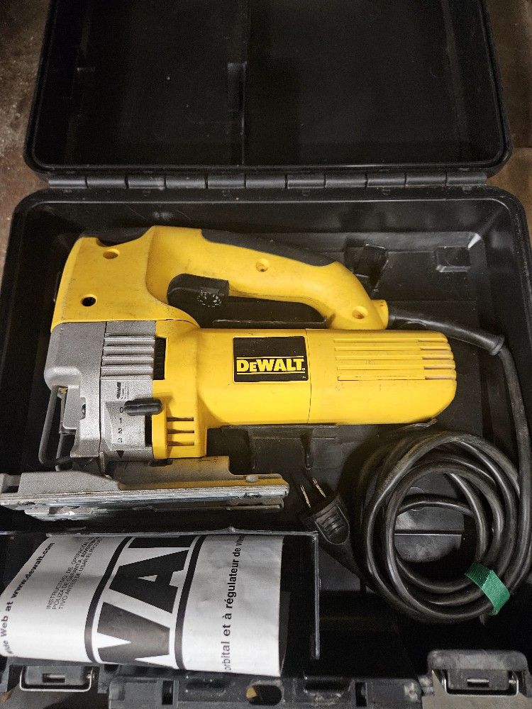 This Dewalt Jigsaw (DW321) is slightly used and in great shape. Has a powerful 5.8 amp motor delivering the cutting power needed for the hardest jobs. Comes with 1 new wood/plastic/thin metal T blade and as shown in pictures the Dewalt black plastic case. - Specifications include variable speed switch located on upper handle lower side of grip, dust blower which is great when your trying to stay on the cutting line, removable shoe cover, straight line or orbiting action, and has a beveled cutting adjustment.