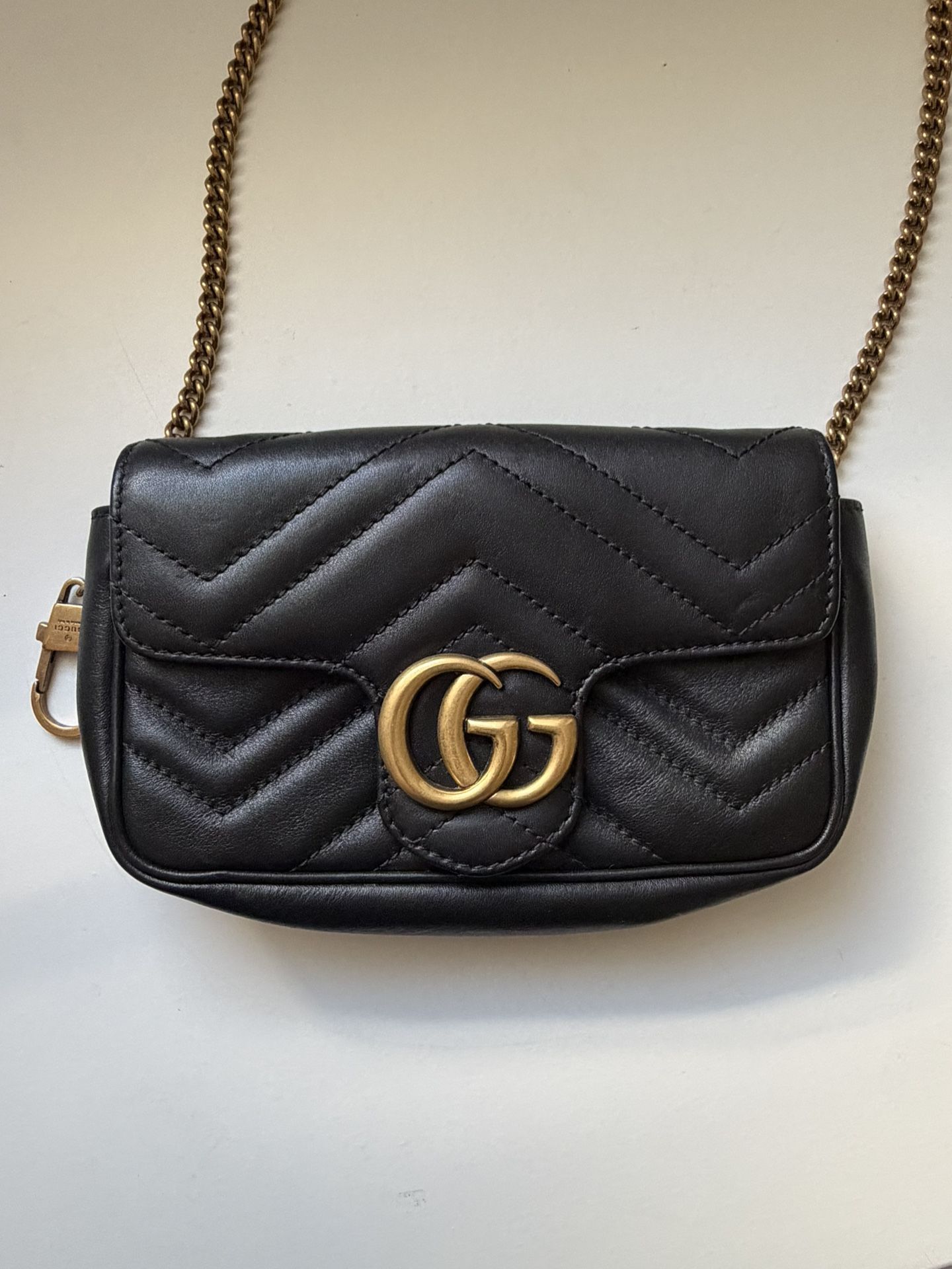 A piece from Gucci’s Marmont collection - retails for about $1,550 brand new! Perfect condition with no signs of wear. Matelassé chevron lambskin leather with gold-tone hardware, featuring the signature Double G logo on the front and a gold chain shoulder strap! Dimensions: Approximately 7.5” wide x 4.5” tall.