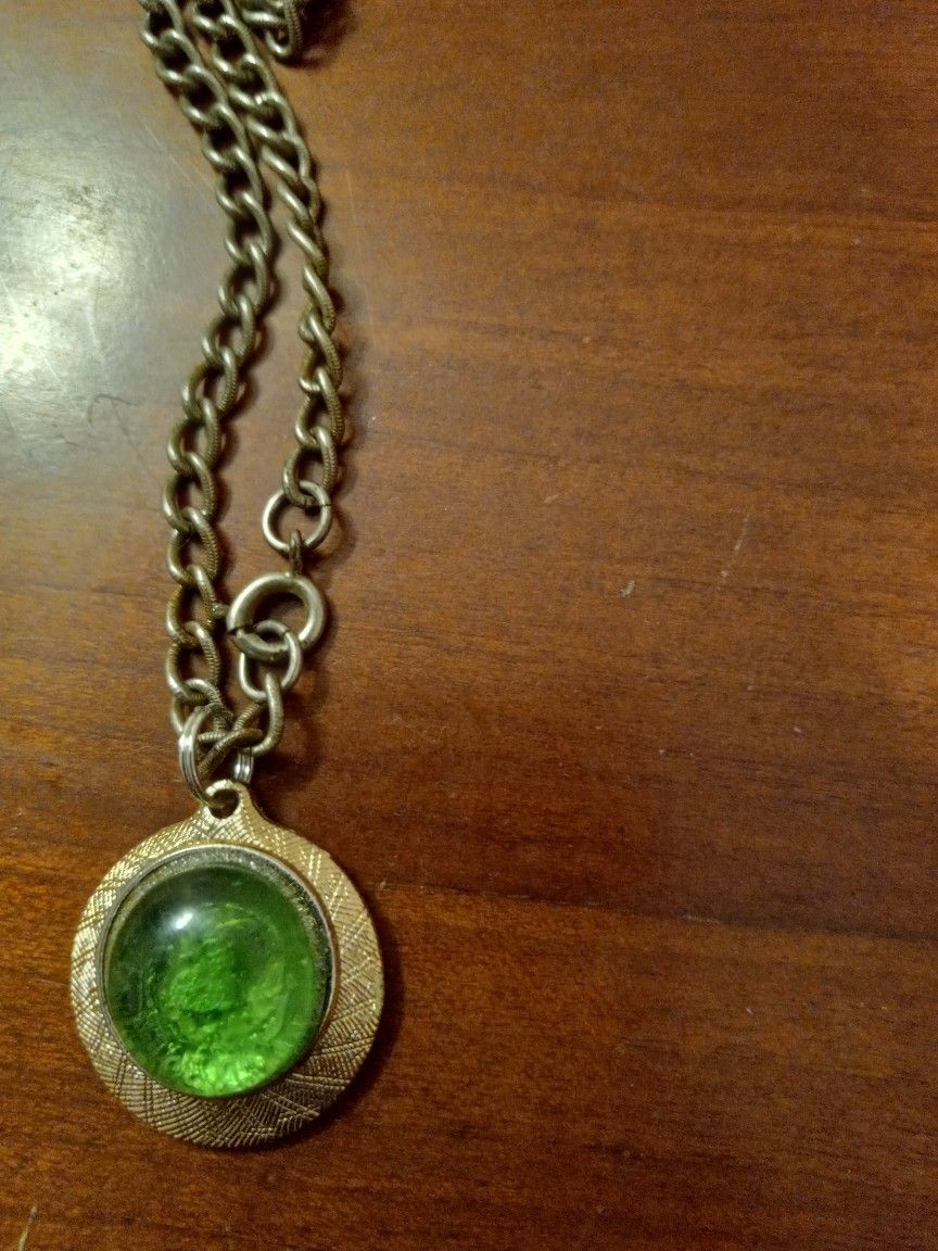 Golden colored metal chain with rounded golden and bright green stone attached. Well crafted. Beautiful!