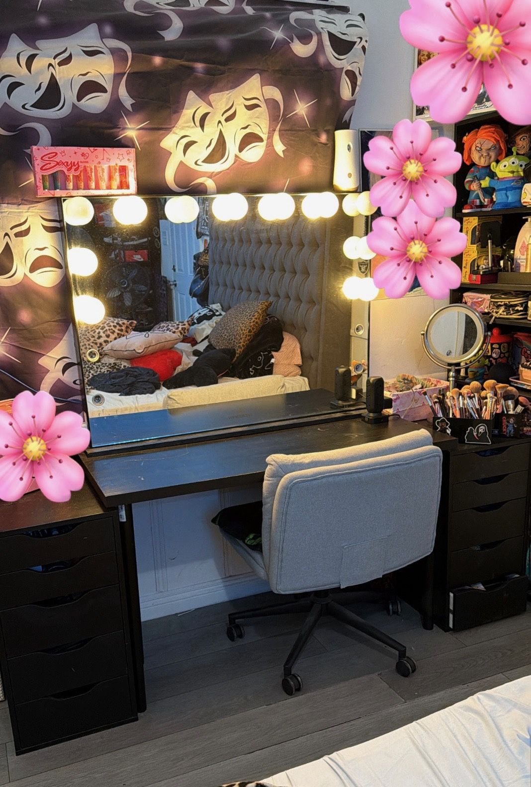 Makeup Vanity Set!!! Includes Chair,Desk,Alex Drawers,Mirror Mirror Includes- Different settings for color tones Outlet -2 plug ins On/Off Switch Desk has adjustable legs for height Mirror alone worth $400 NEED GONE ASAP!!! SERIOUS BUYERS ONLY