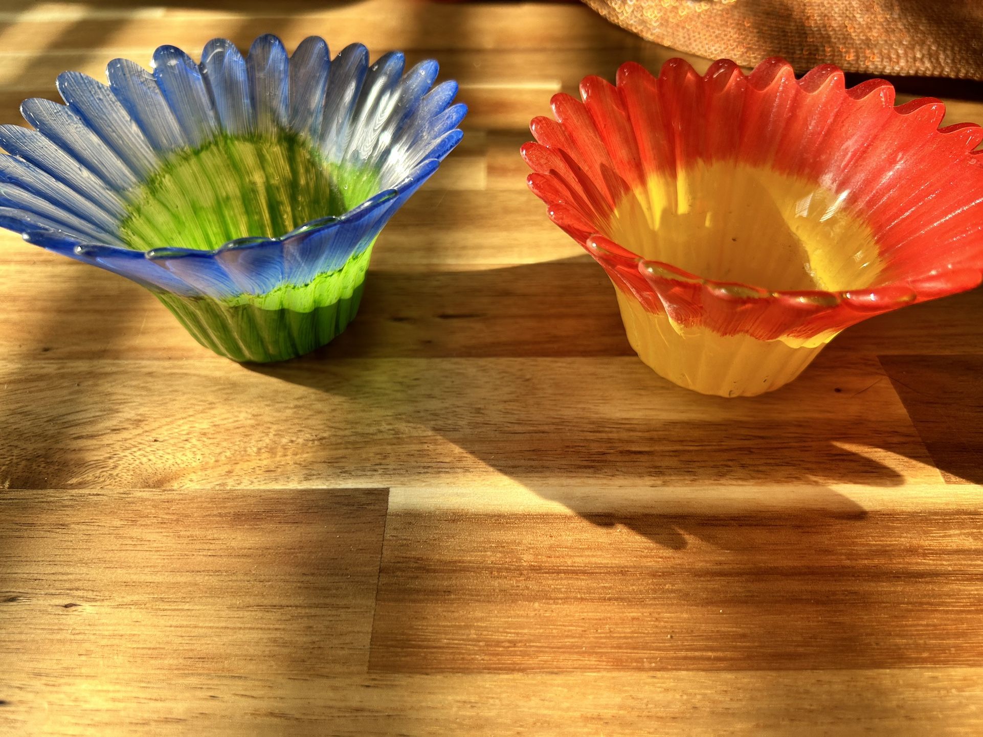 Glass flower decoration candle holder set. Excellent condition, bright beautiful colors .