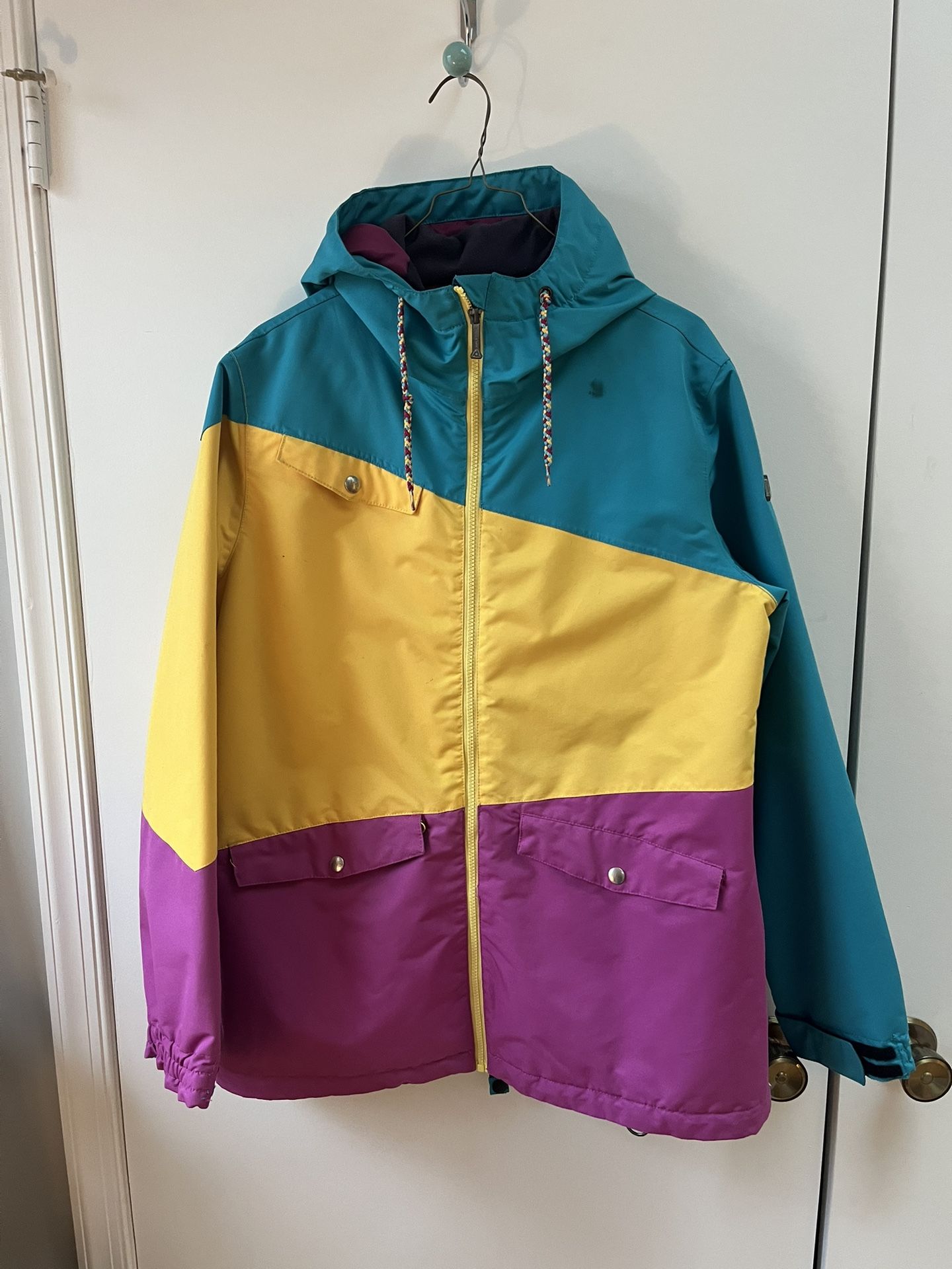Size large women’s ski/snowboard coat from brand Aperture Very well insulated and true to size Well loved for 2 seasons, has a few beauty marks Colors are true to first photo Bright teal, yellow, and pink/magenta Stand out on the hill! Your friends will be able to spot you easily!