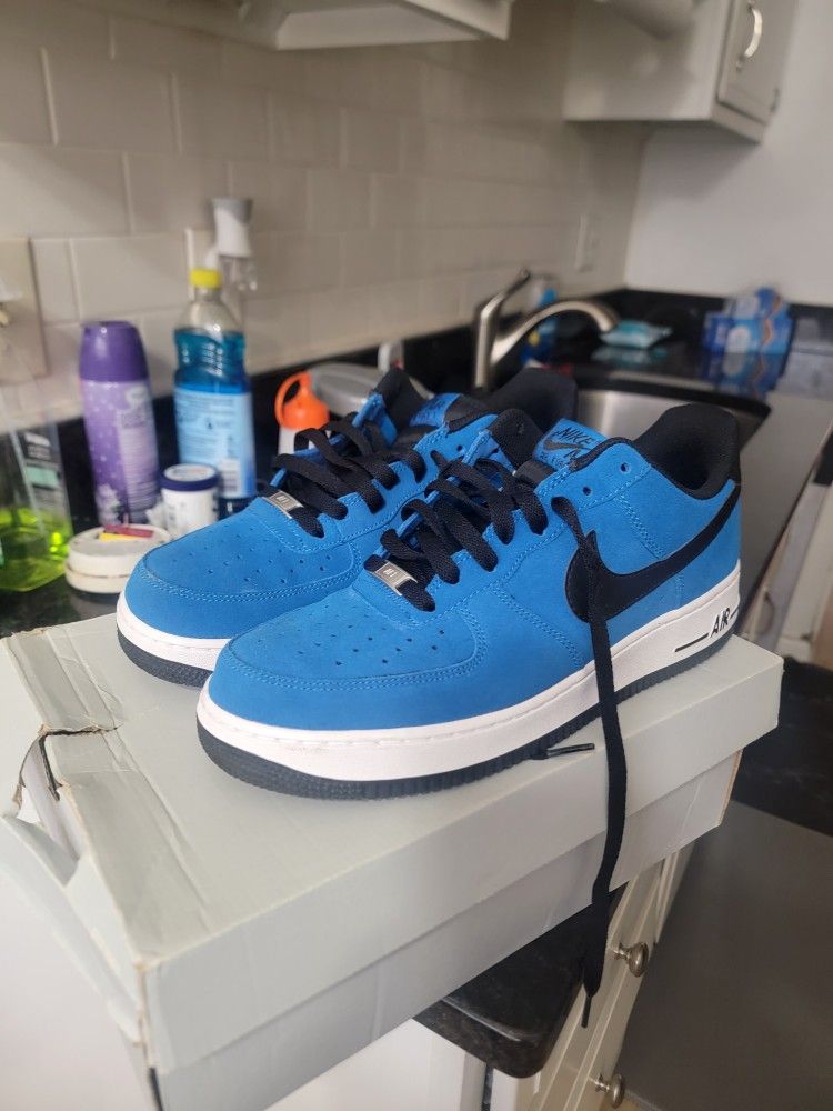 Military Blue and black Air Force 1's. Worn just a couple times. In good condition. Orginal box and comes with matching blue laces. Little dirt on bottom of one shoes but a little water and scrub will get it out. Cant fit them anymore. Looking for 60.