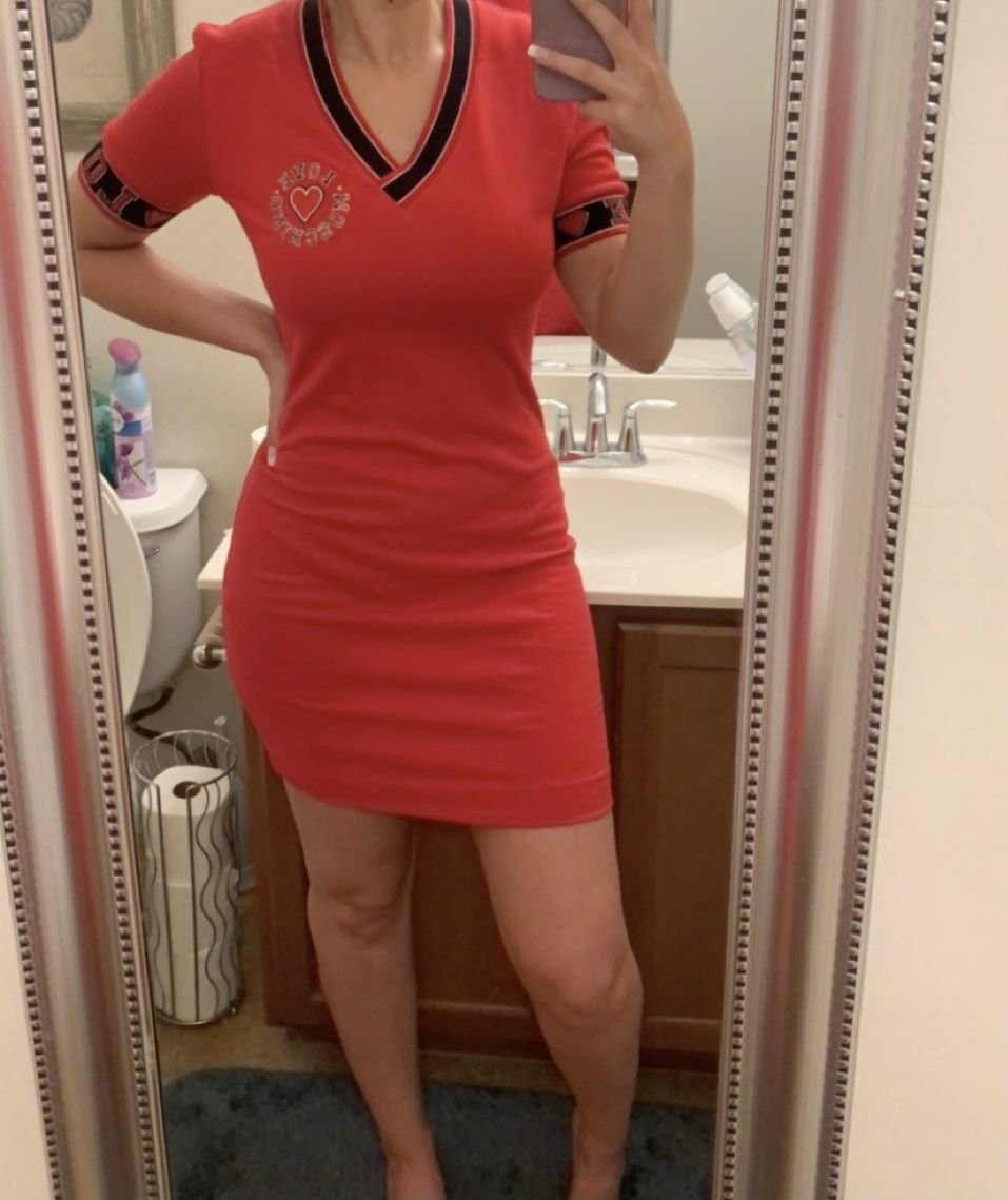 Red love moschino varsity shirt dress! only worn once, like new condition!! Size 6. I am 5’9 for length reference.
