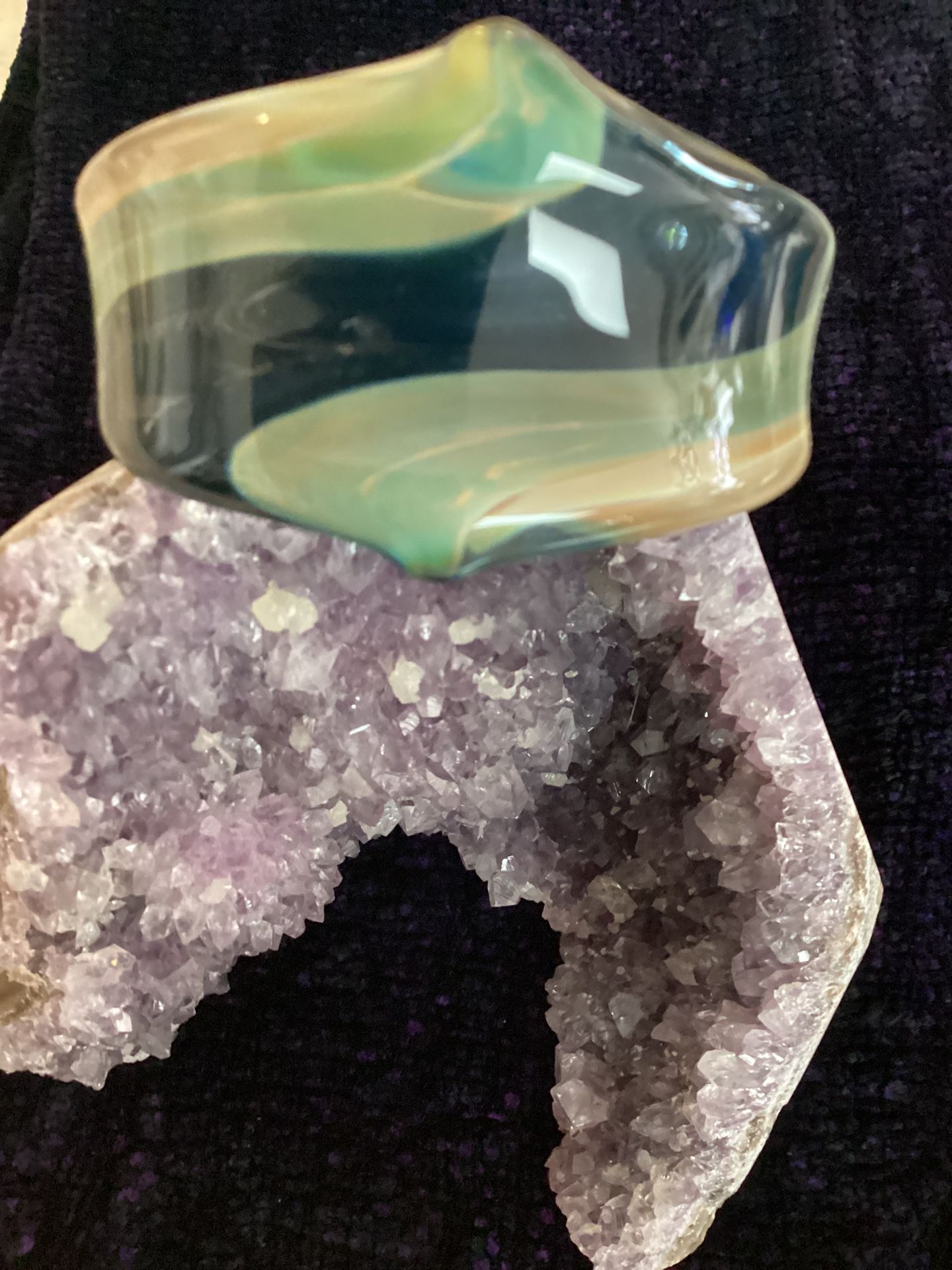 Glass bracelet with colors of navy,turquoise,green,olive tan