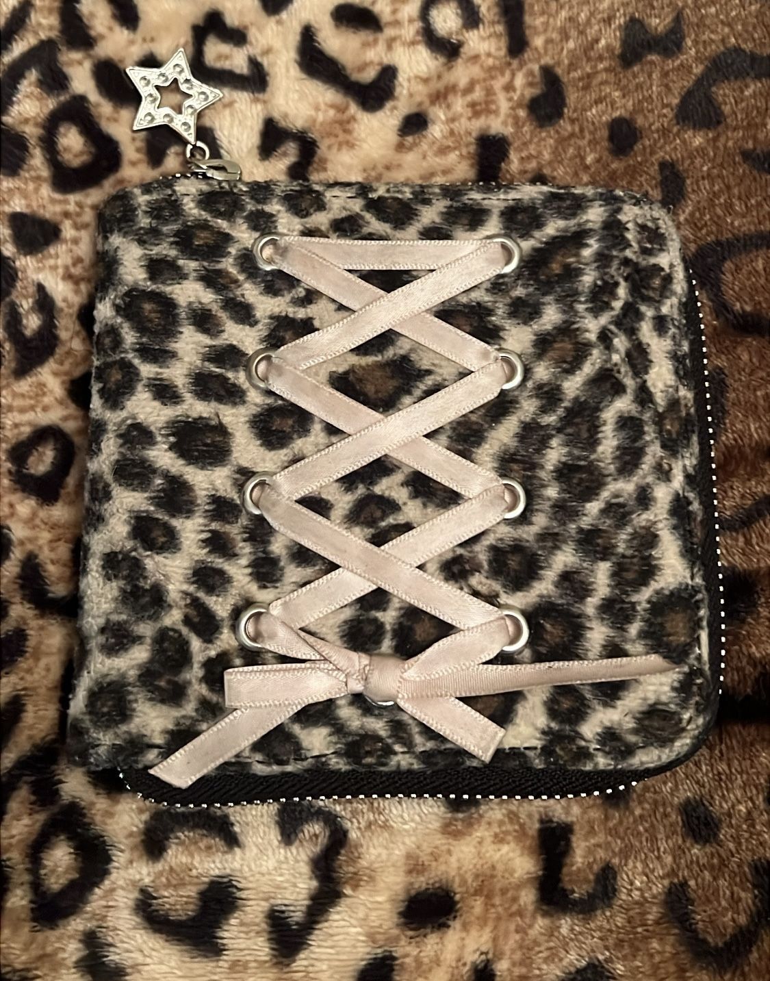 🪪 in used but excellent condition still, no stains, holes, or any damage. deadstock and is hard to find anywhere else, sold out on the main heavensent website, Y2K leopard print lily corset lace up pink ribbon wallet. ☑️ $95 open to REASONABLE offers 🔆 please ONLY message me if your serious about setting up a time and place to meet
