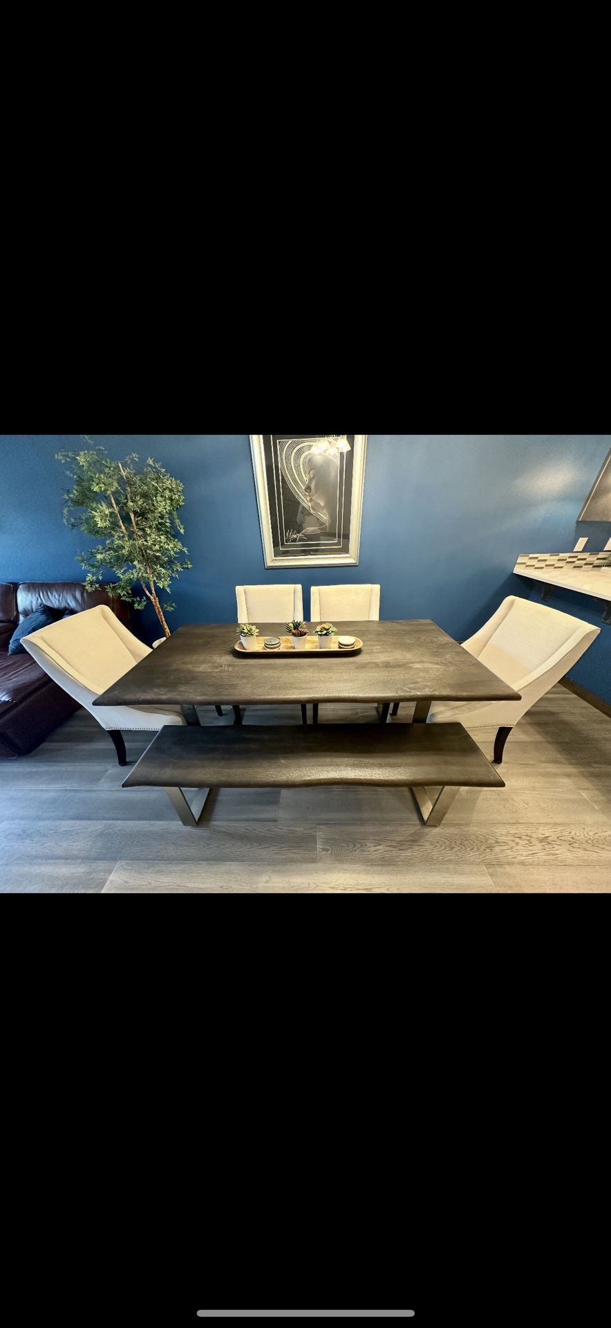 Wood visual dining room table plus bench. Table is about 6-7 feet long x 4 feet wide… bench is about 5 feet long. 215 for both. Chairs have been sold and are not included