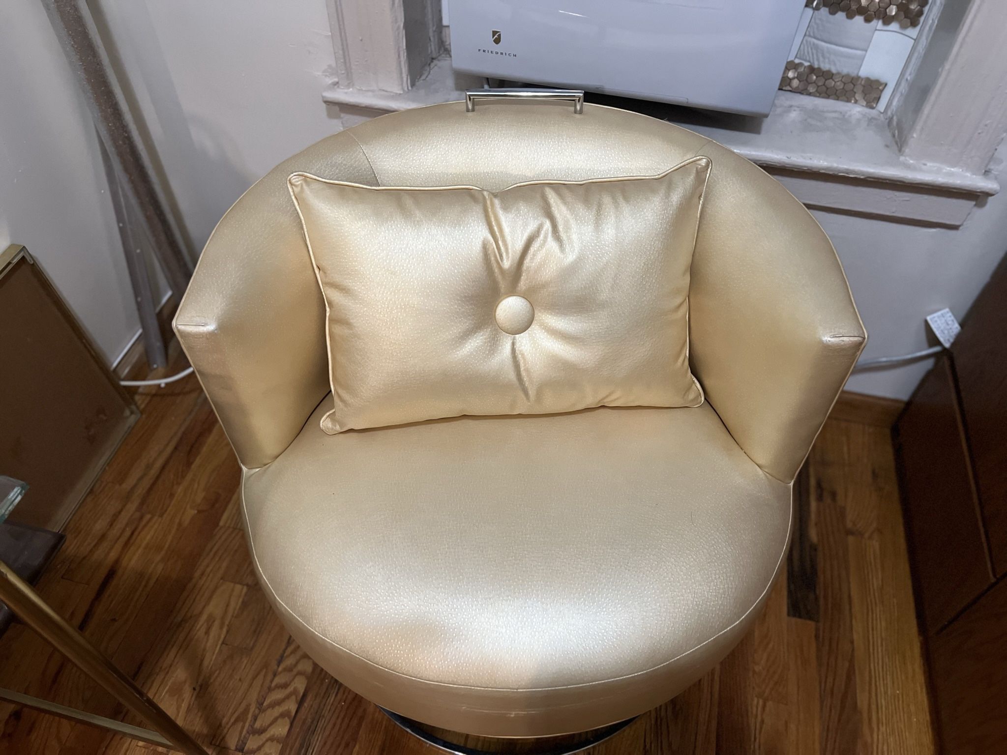 Retro 70’’s styled swivel chair with decorative pillow. Made of waterproof stain-free material. W silver plated solid metal