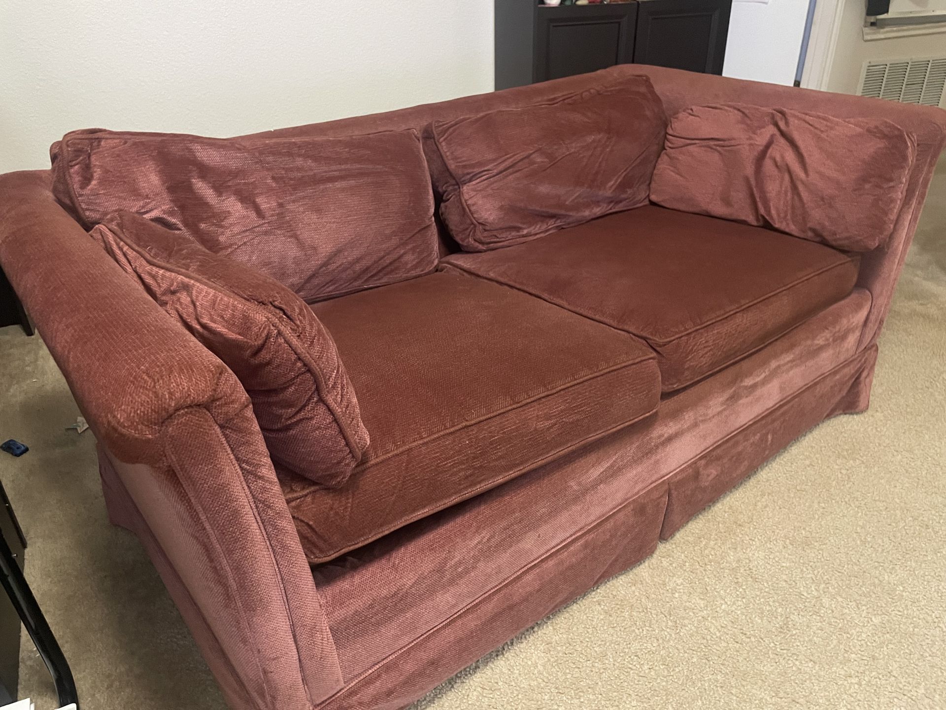 • Traditional rolled-arm loveseat • Chenille / microfiber style upholstery • Skirted base • Structurally sound with normal cushion wear -comfortable, durable, traditional sofa with low back