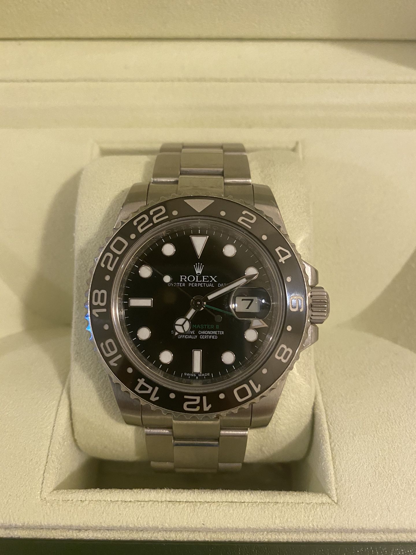 GMT Master II Reference 116710 (discontinued). Stainless steel . Black dial & black bezel. Dated 2012. Normal scratching. Includes original, box, papers, warranty card and box. Classic, beautiful watch. Serious buyers only. PRICE IS FIRM. I’m