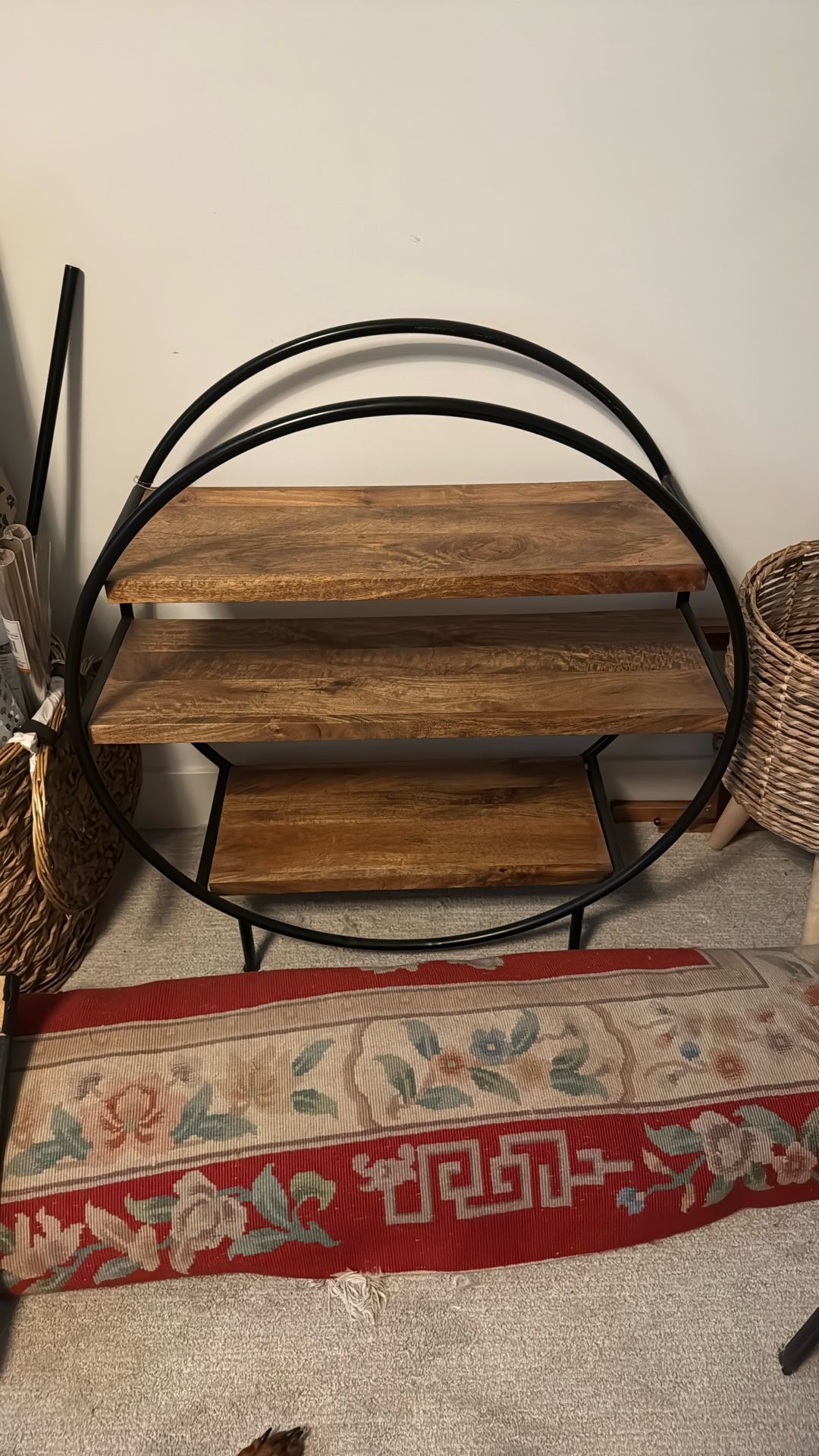 Like new Wood and metal round bookshelf, 3 shelves Originally $130 Vintage, bookshelf, kids shelf, toy shelf, display shelf, shoe shelf, storage, wooden, metal, funky