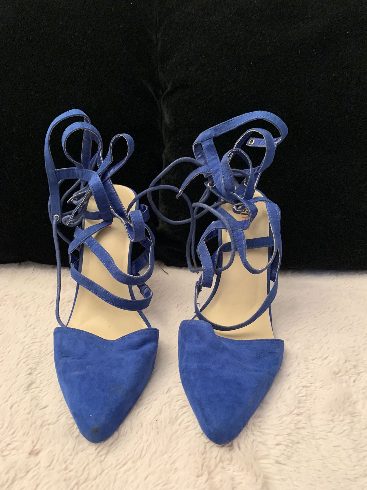Nataya strappy pump with pointed toe, lace up back. Faux suede, Cobalt blue. 4” heel. Size 8
