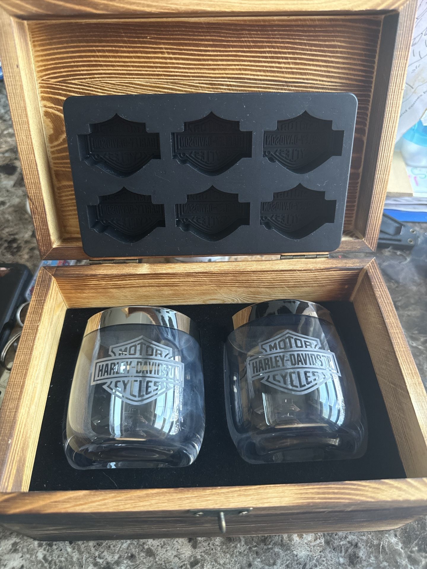 Harley-Davidson whiskey glass gift set with wooden engraved box. Includes 2 etched glasses and silicone ice mold. Excellent condition — perfect gift or man cave item. $55 OBO.