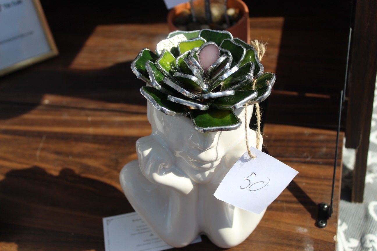 Hey there! This is a one of a kind plant! It's hand cut and soldered glass so it'll never die. The ceramic pot also comes with it.