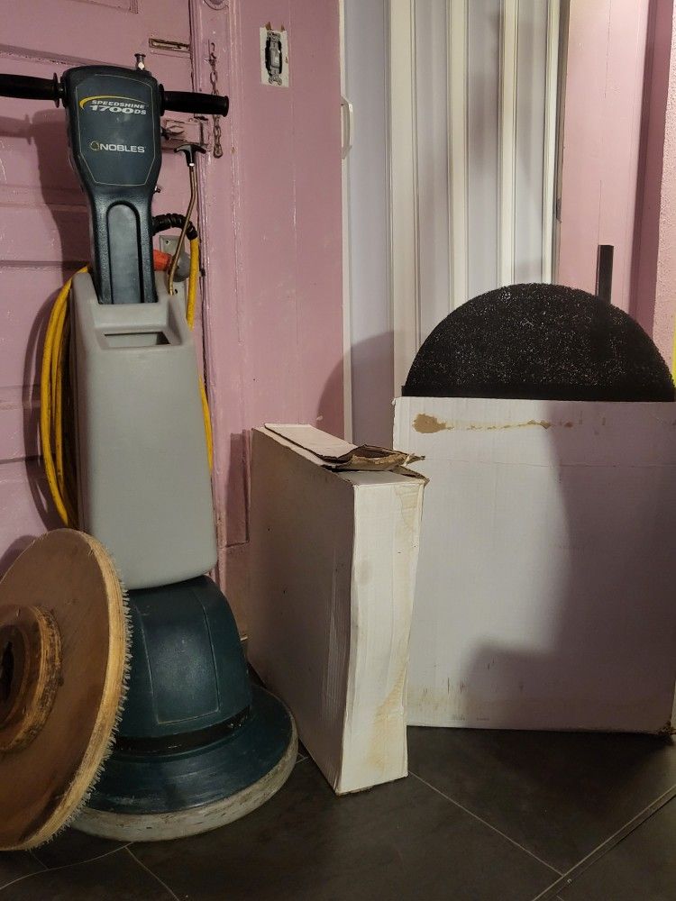 Nobles Speedshine Side by Side Buffer with Water & Chemical Dispense Tank. This machine has 2 speeds high & low, comes with 20 inch clutch plate also comes with 11 20 inch black pads for stripping wax flooring. Machine is well maintained and cleaned thoroughly after every job this is a money maker. Machine comes with pads 500.00.These machines are designed for stripping, scrubbing, buffing, and polishing.