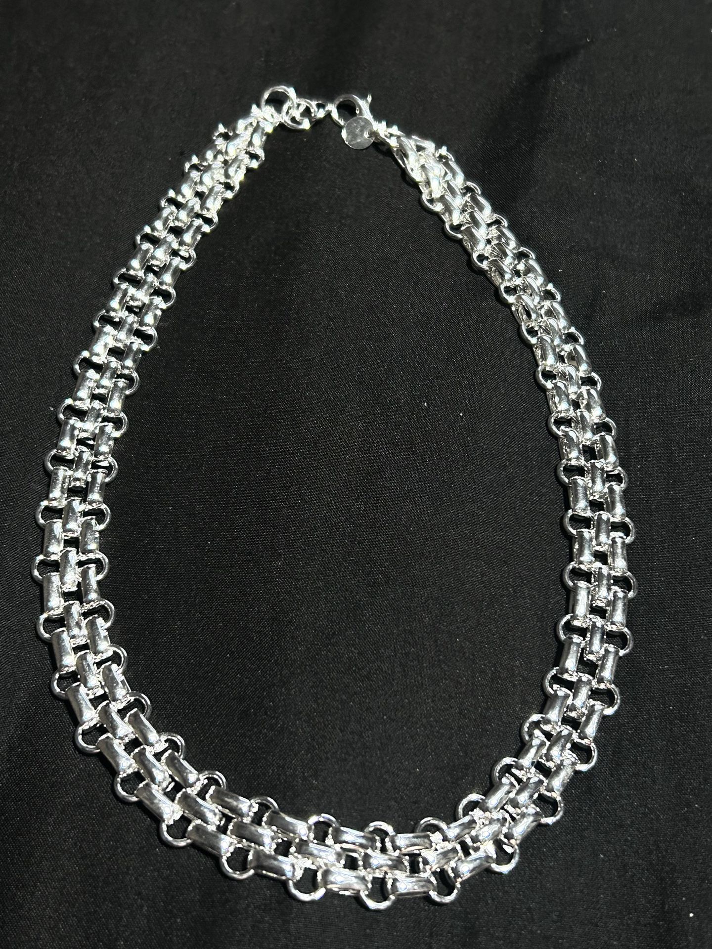 925 Sterling silver triple-row interlocking link necklace, often referred to as a railroad chain. 18 inches. Visit my page for more items DISCLOSURE: Sterling Silver material requires special care and use. Please research what is needed to keep it clean and shinny What is the meaning of S925 silver? sterling silver When shopping for silver rings and other pieces of silver jewelry you may see a small stamp on the inside, and if you look closely, it may read s925 or 925. This stamp means the piece is made of sterling silver, or in other words, the metal is 92.5% pure. This is the real deal!